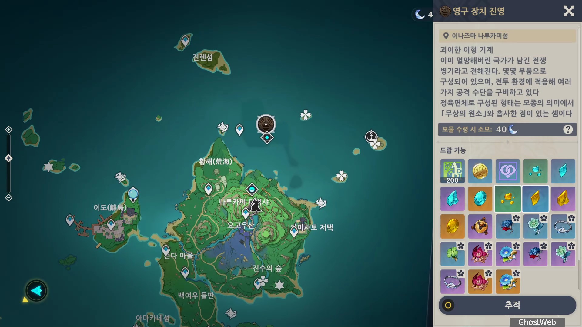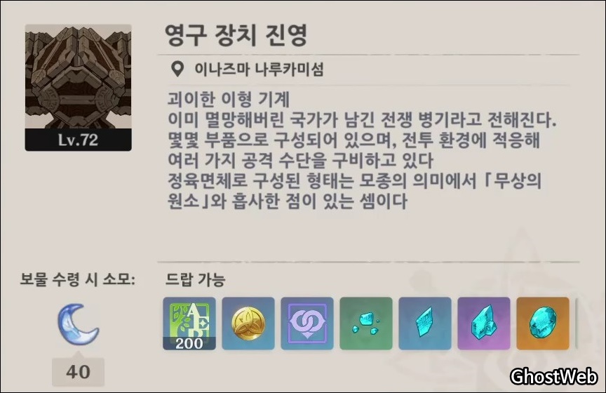 이나즈마 나루카미섬 북쪽 지하 동굴에 있는 <영구 장치 진영>에 도전하면 <카미사토 아야카>의 캐릭터 육성 소재인 <영구 장치의 코어>을 얻을 수 있어요.