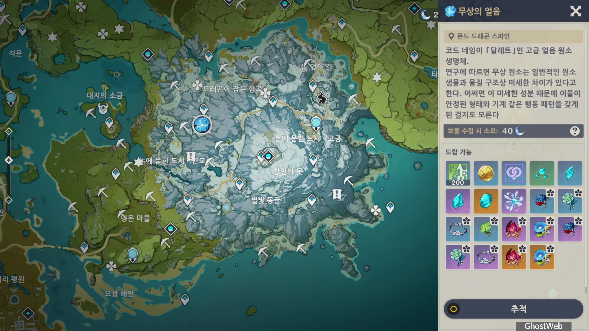 몬드 성 아래에 있는 드래곤 스파인(설산) 중앙을 기준으로 10시 방향에 있는 <무상의 얼음>에 도전하면 <유라>, <에일로이>의 캐릭터 육성 소재인 <응결의 꽃>을 얻을 수 있어요.