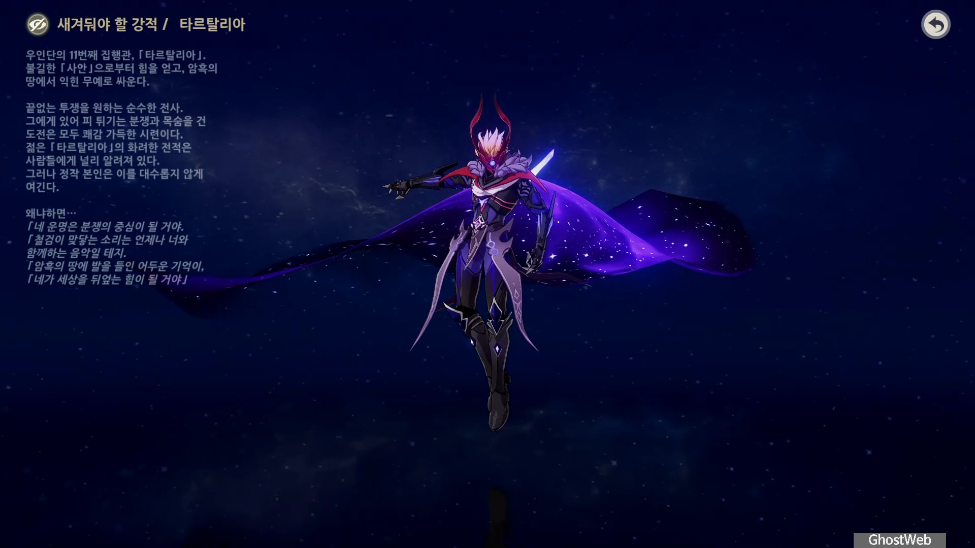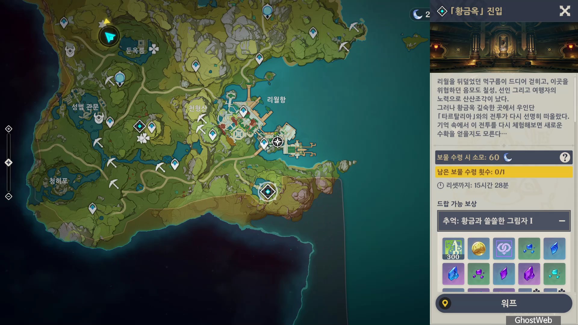 리월 항 6시 방향에 있는 <황금옥, 타르탈리아>에 도전하면 캐릭터 육성 소재인 <하늘을 삼킨 고래/마왕의 칼날/무예의 혼>을 얻을 수 있어요.