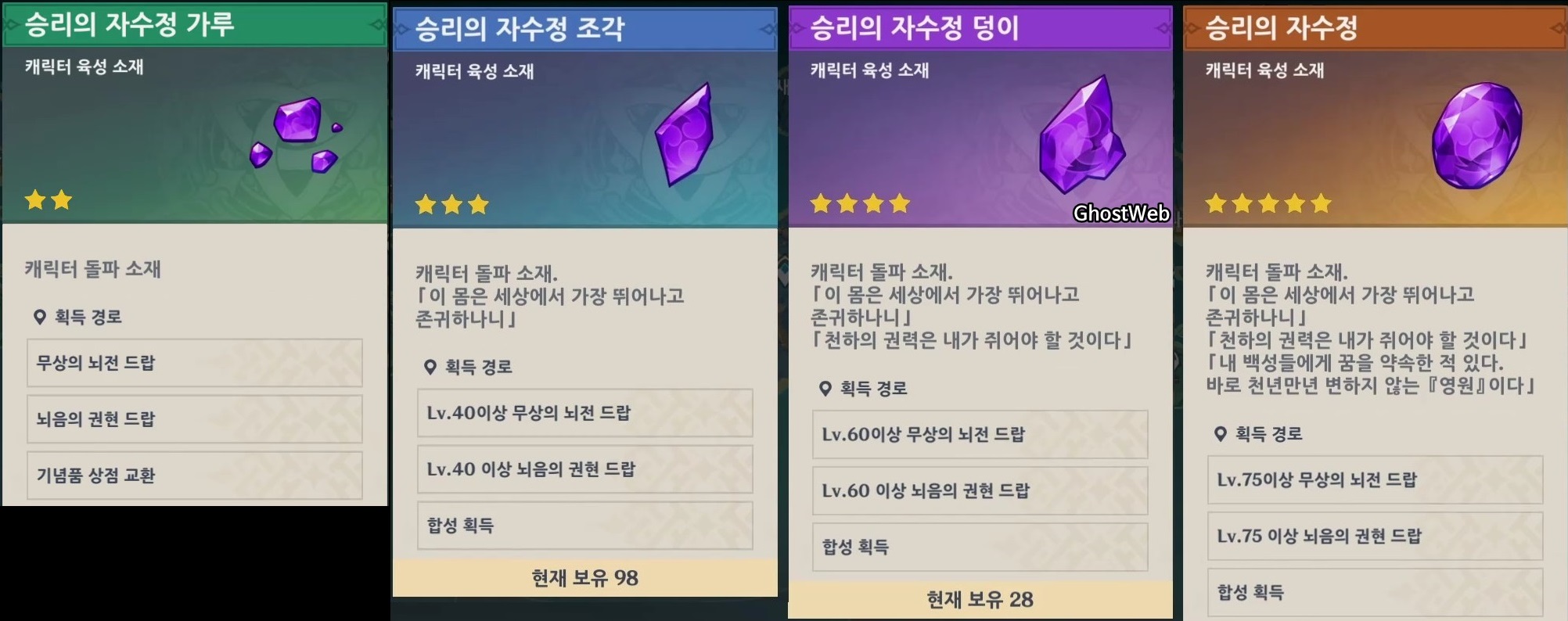 - 승리의 자수정 가루, 승리의 자수정 조각, 승리의 자수정 덩이, 승리의 자수정 (번개 원소 캐릭터 육성 소재)