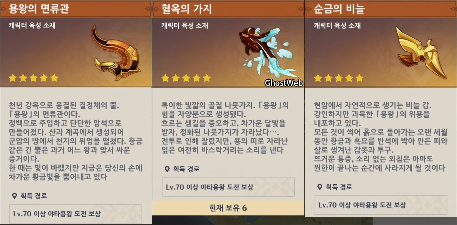 - 용왕의 면류관, 혈옥의 가지, 순금의 비늘 (캐릭터 육성 소재, Lv70 이상 야타용왕 도전 보상)