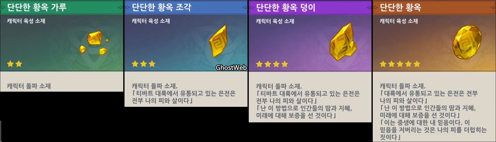 - 단단한 황옥 가루, 단단한 황옥 조각, 단단한 황옥 덩이, 단단한 황옥 (바위 원소 캐릭터 육성 소재)