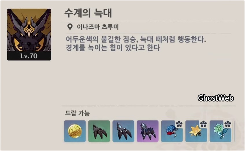 수계 늑대는 이나즈마 츠루미에서 만날 수 있으며, 처치 시 캐릭터 육성 소재인 맹수 발톱, 매수의 날카로운 발톱, 맹수의 구신 발톱과 성유물(전쟁광, 교관, 유배자)를 얻을 수 있어요.