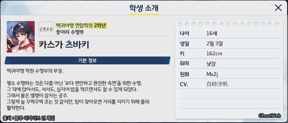 | 설명 | 백귀야행 학원 수행부의 부장. 평소 수행하는 것은 다름 아닌 '보다 편안하고 완전한 숙면'을 위한 수행. 그 덕에 앉아서도, 서서도, 심지어 밥을 먹으면서도 잘 수 있게 되었다. 그래서 붙은 별명이 잠자는 공주. 그렇게 늘 꾸벅꾸벅 조는 것 같지만, 밤이 찾아오면 거리를 지키기 위해 몰래 활약한다. ![]() |