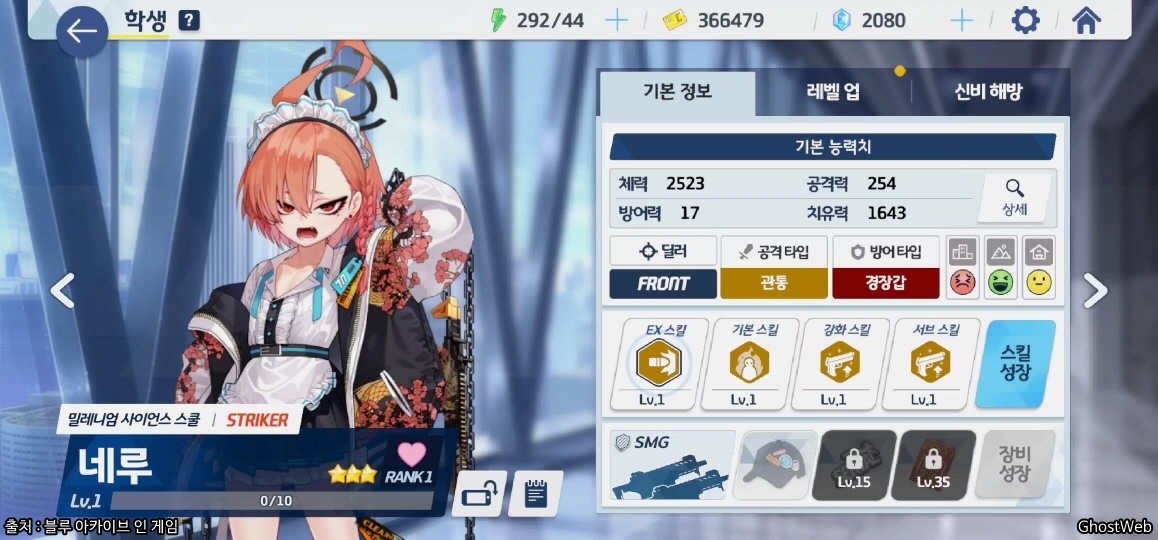 | 등급 / 무기 / 타입 | 3성 / SMG / 딜러 - FRONT |