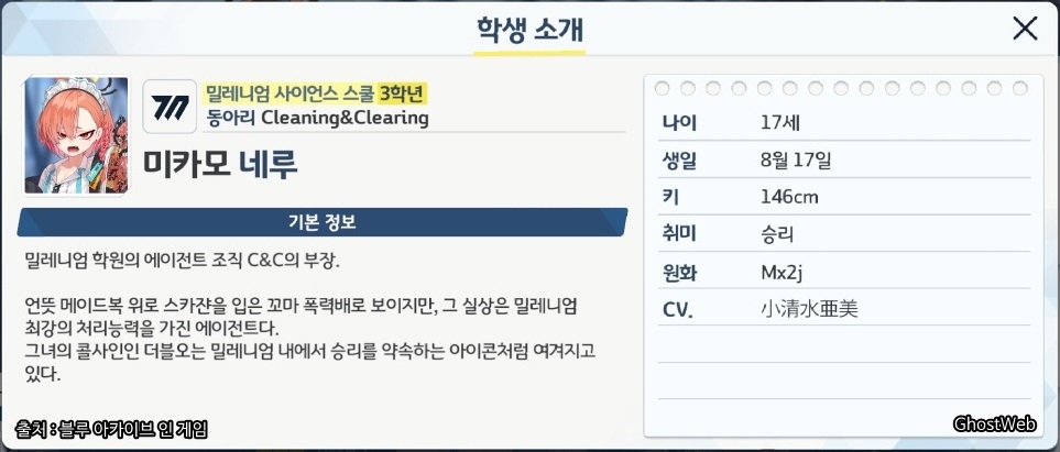 | 설명 | 밀레니엄 학원의 에이전트 조직 C&C의 부장. 언뜻 메이드복 위로 스카쟌을 입은 꼬마 폭력배로 보이지만, 그 실상은 밀레니엄 최강의 처리능력을 가진 에이전트다. 그녀의 콜사인인 더블오는 밀레니엄 내에서 승리를 약속하는 아이콘처럼 여겨지고 있다. ![]() |