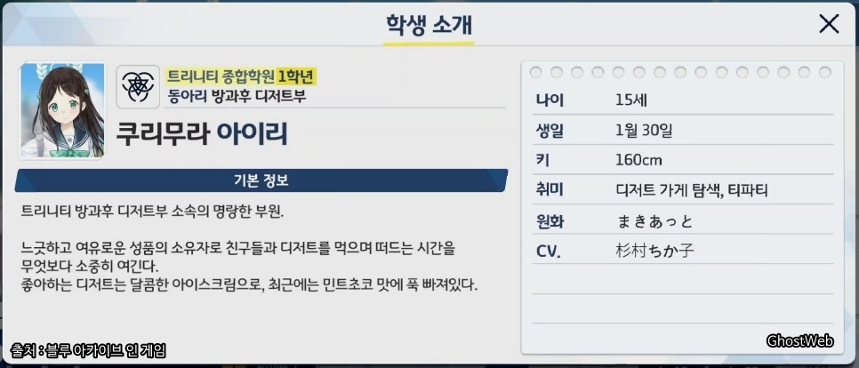 | 설명 | 트리니티 방과후 디저트부 소속의 명량한 부원. 느긋하고 여유로운 성품의 소유자로 친구들과 디저트를 먹으며 떠드는 시간을 무엇보다 소중히 여긴다. 좋아하는 디저트는 달콤한 아이스크림으로, 최근에는 민트초코 맛에 푹 빠져있다. ![]() |