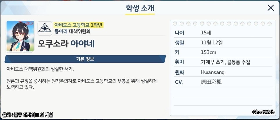 | 설명 | 아비도스 대책위원회의 성실한 서기. 원론과 규정을 중시하는 원칙주의자로 아비도스 고등학교의 부흥을 위해 성실하게 노력하고 있다. ![]() |