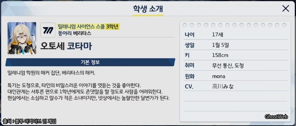 | 설명 | 밀레니엄 학원의 해커 집단, 베리타스의 해커. 특기는 도청으로, 타인의 비밀스러운 이야기를 엿듣는 것을 좋아한다. 대인관계는 서투른 편으로 1학년에게도 존댓말을 할 정도로 사람을 어려워한다. 현실에서는 소심하고 말수가 적은 소년이지만, 넷상에서는 놀랄만한 달변가가 된다. ![]() |