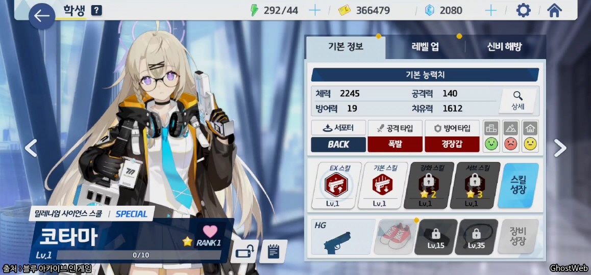 | 등급 / 무기 / 타입 | 1성 / HG / 서포터 - BACK |