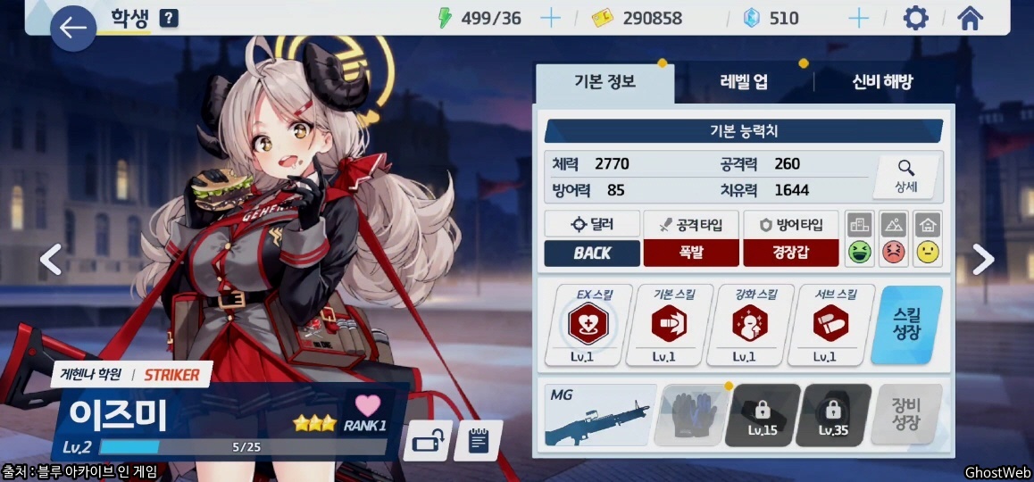 | 등급 / 무기 / 타입 / 전술 역할 | 3성 / MG / 딜러 / STRIKER |