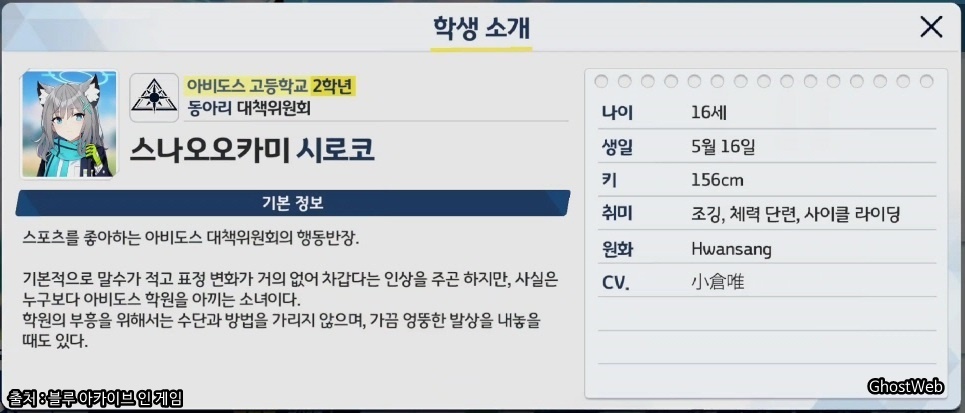 | 캐릭터 등장 | 아비도스 대책위원회 2학년 스나오오카미 시로코야. 잘 부탁해. |