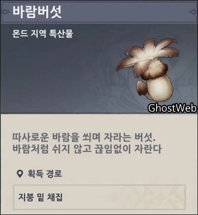 이번에는 몬드 지역 특산물이고 캐릭터 육성 소재인 <바람버섯>을 얻을 수 있는 위치를 정리해보도록 할게요.