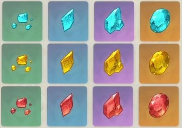 - 단단한 황옥 가루, 단단한 황옥 조각, 단단한 황옥 덩이, 단단한 황옥 (바위 원소 캐릭터 육성 소재)
