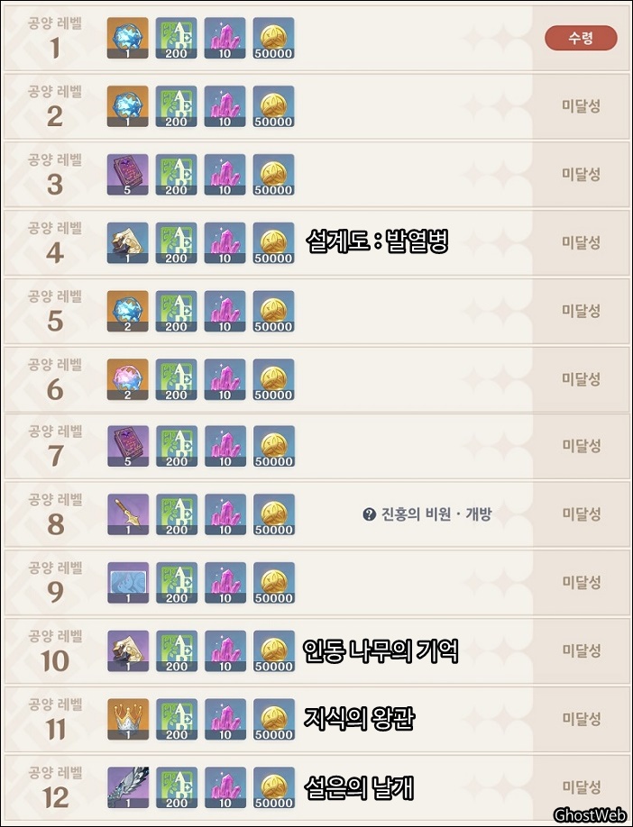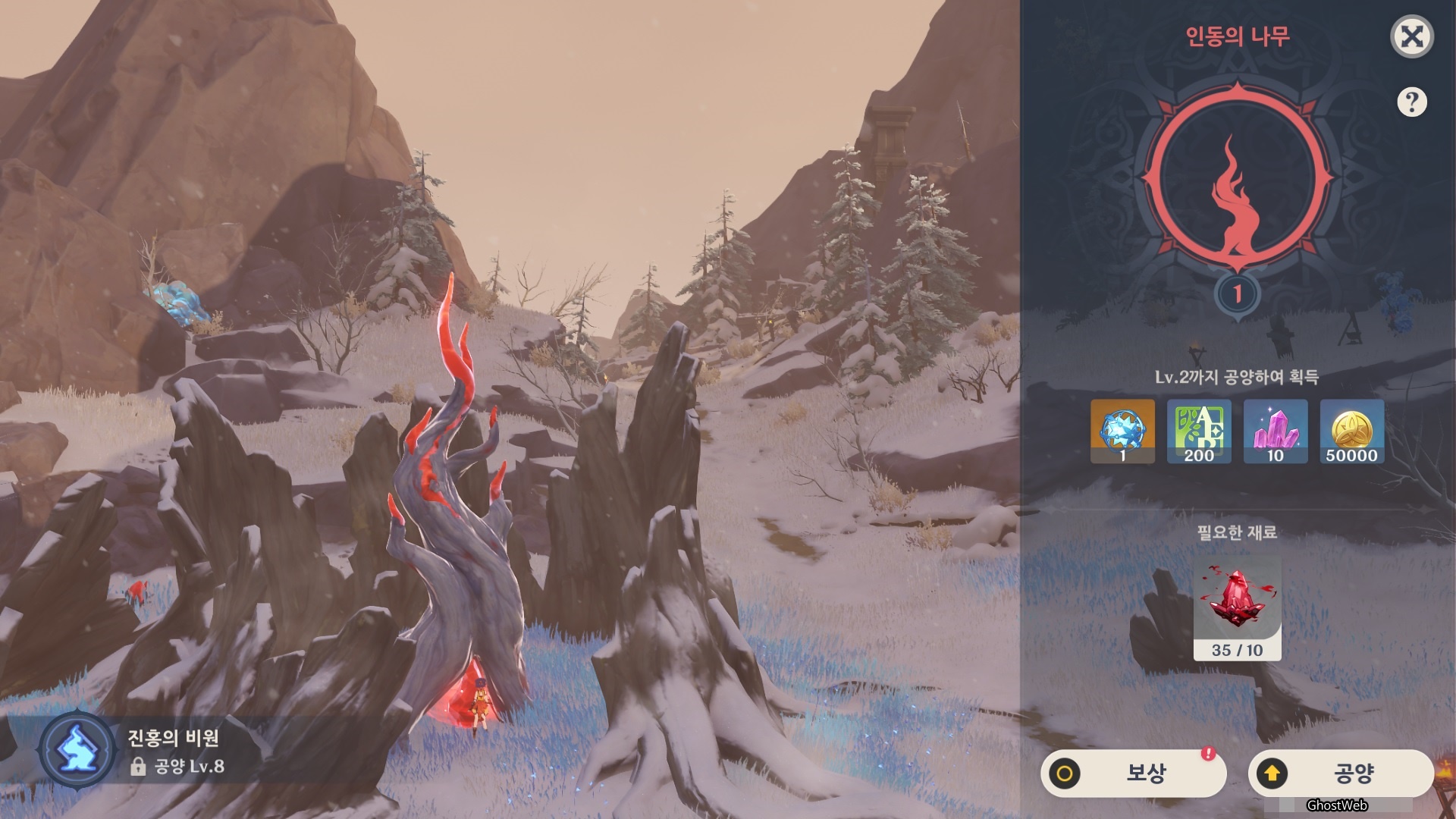 진홍의 옥수를 모아 인동의 나무에 공양을 통해 만남의 인연, 뒤얽힌 인연, 지식의 왕관, 설은의 날개 등의 보상을 획득할 수 있어요.