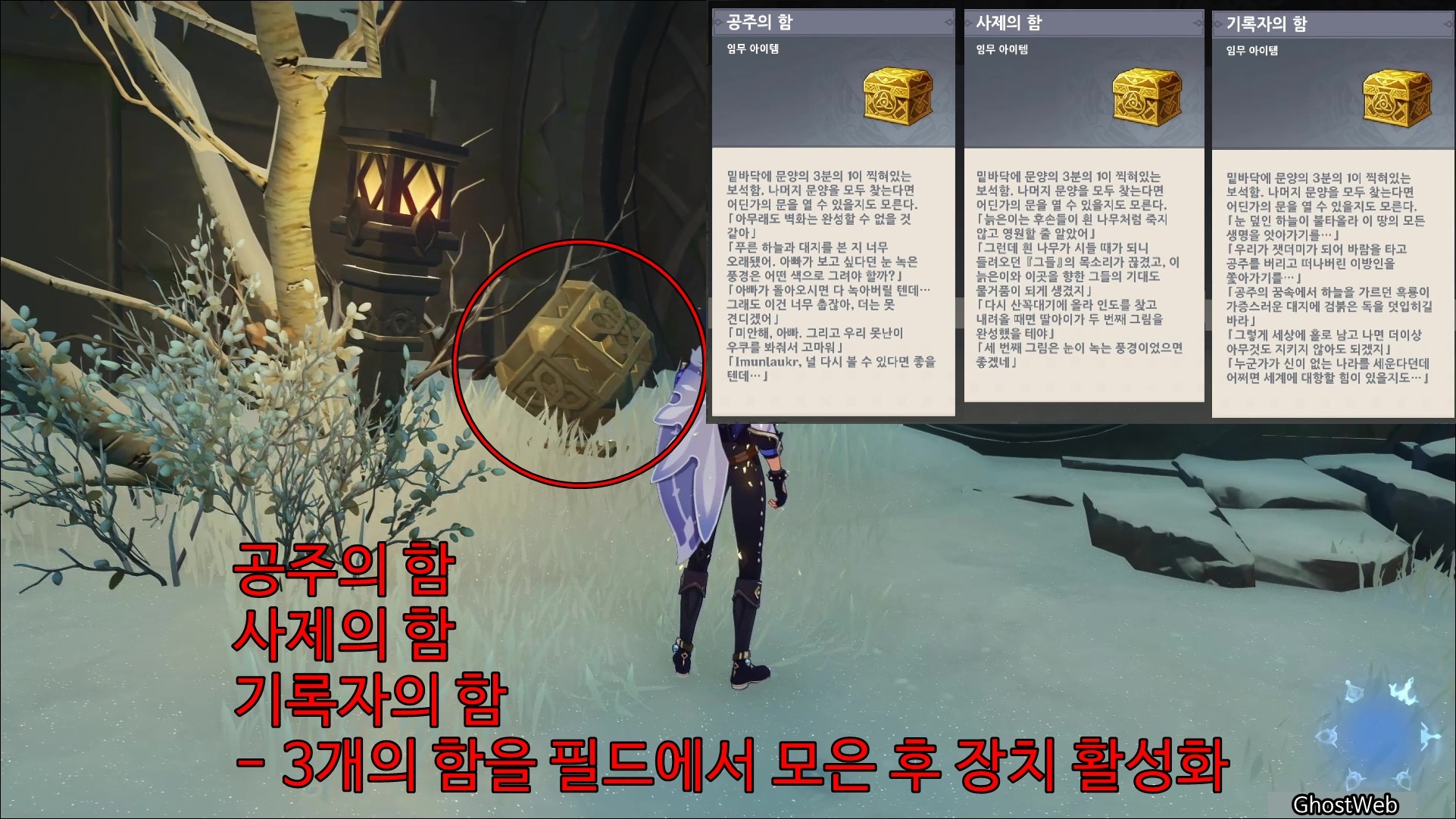 [원신] 설산 밀실 대문 여는 방법 (공주의 함, 사제의 함, 기록자의 함 얻는 방법 및 위치)