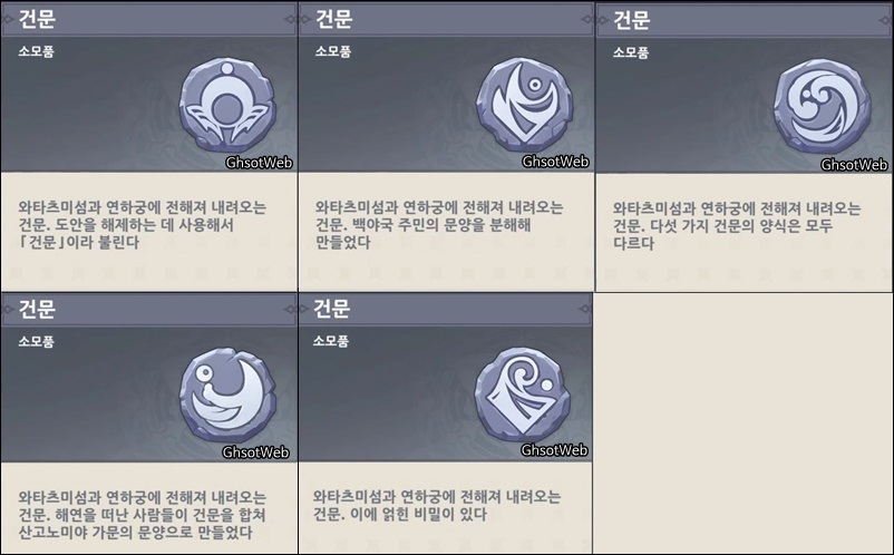 총 5 종류의 건문이 연하궁 곳곳에 위치하여 연하궁을 탐험하며 비행, 등반 등을 통하여 얻을 수 있어요.