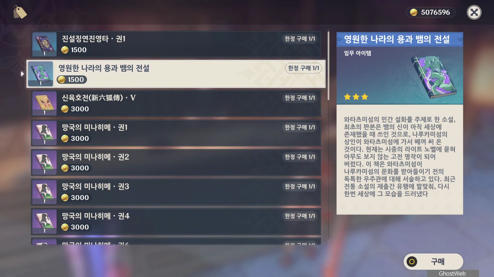 3. 영원한 나라의 용과 뱀의 전설 (이나즈마 야에 출판사 쿠로다에게 1500 모라에 구매)