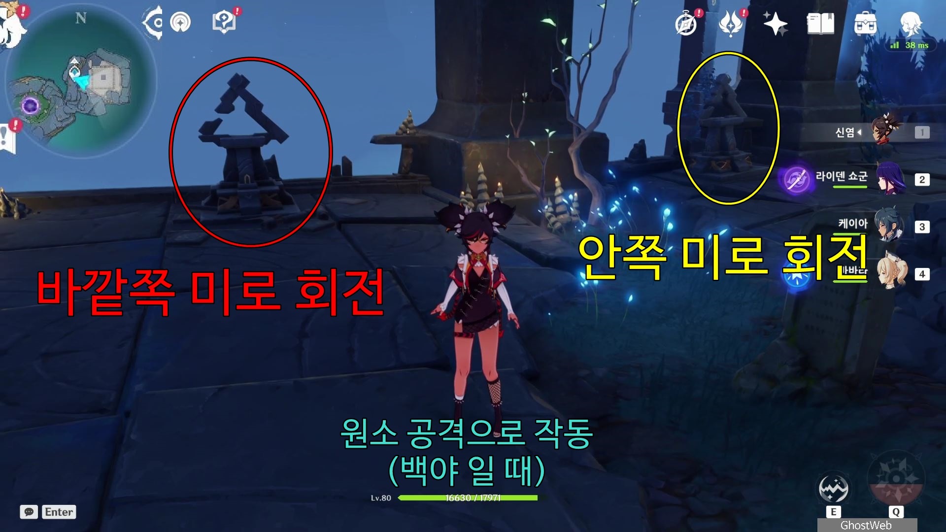 미로 조정 장치는 <백야> 일 때, 원소 공격하여 바깥/안 쪽 미로를 회전하여 아래의 이미지처럼 맞추고 다시 <상야>로 전환하면 미궁 장치가 활성화돼요.