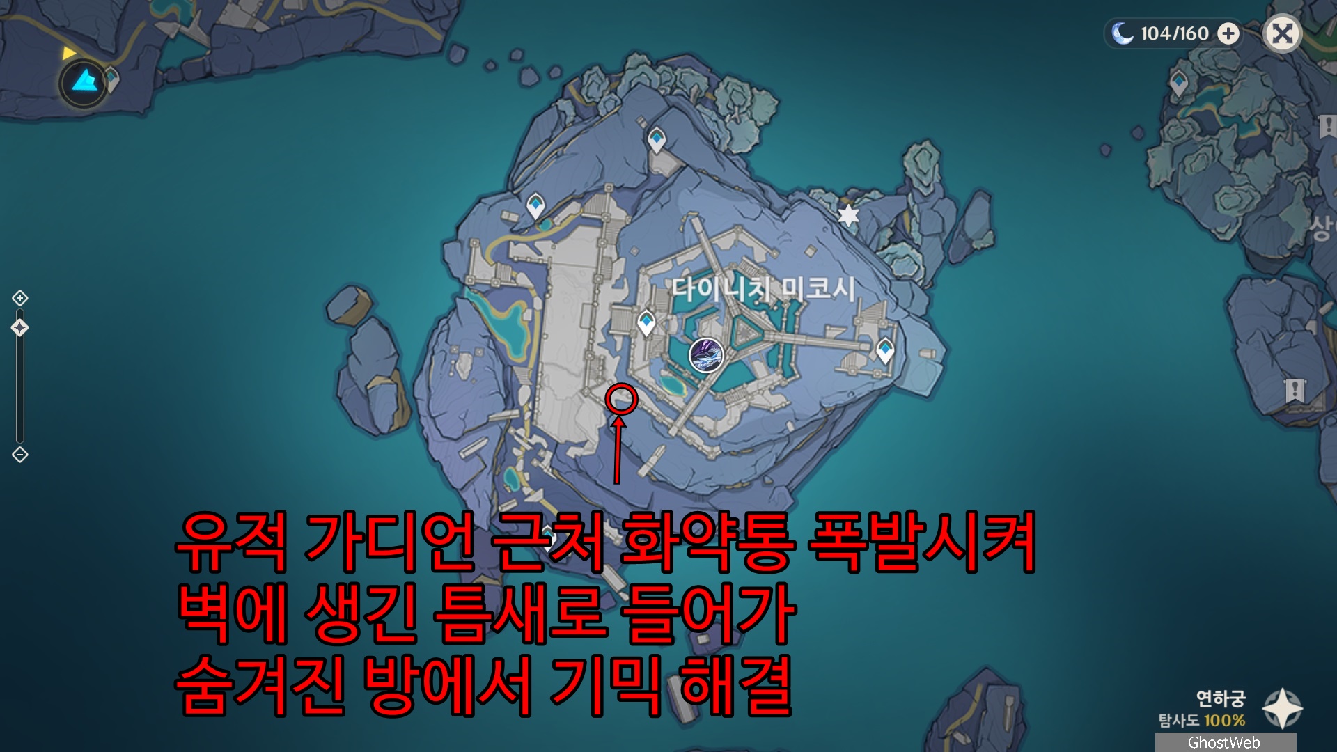 다이니치 미코시 외곽 벽에 유적 가디언이 앉아 있는 곳에 있는 화약통을 폭발시키면 벽이 무너지며 벽에 틈새가 생겨요.