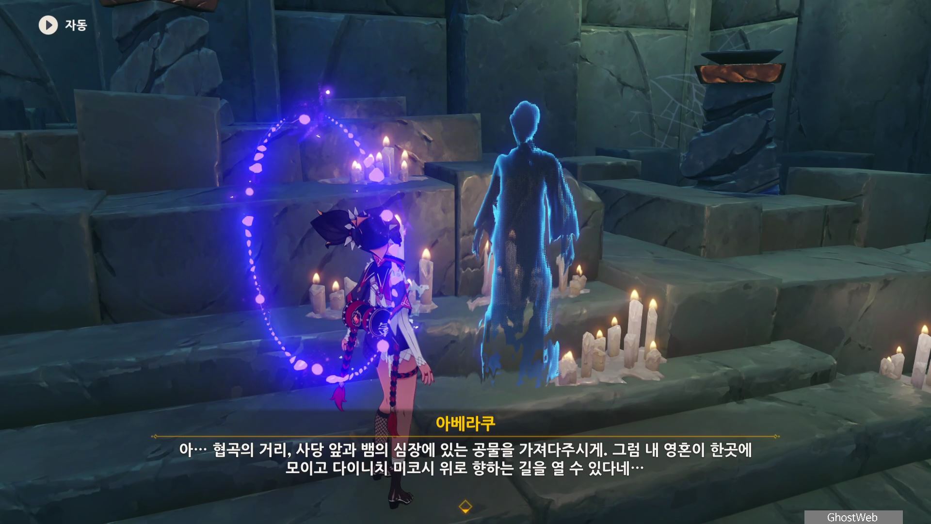 해당 임무는 상야(밤)에 진행해야 아베라쿠를 만날 수 있고 협곡의 거리, 상야의 사당(사당 앞), 뱀의 심장에서 건문을 이용해 봉쇄 해제해서 나온 아베라쿠에게 말을 걸어 시련을 먼저 시작해도 임무 진행(순서) 상 문제는 없어요.