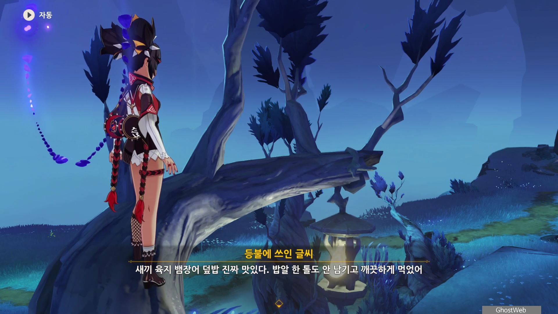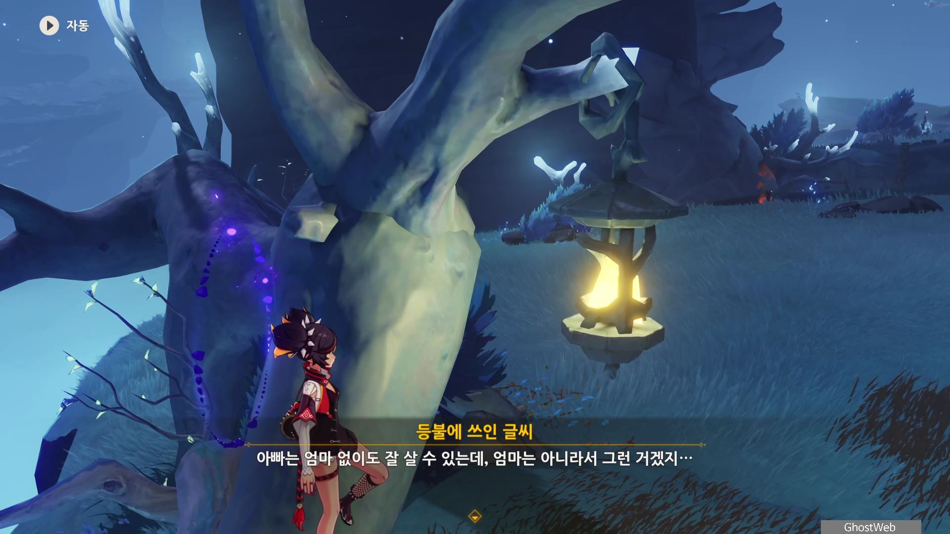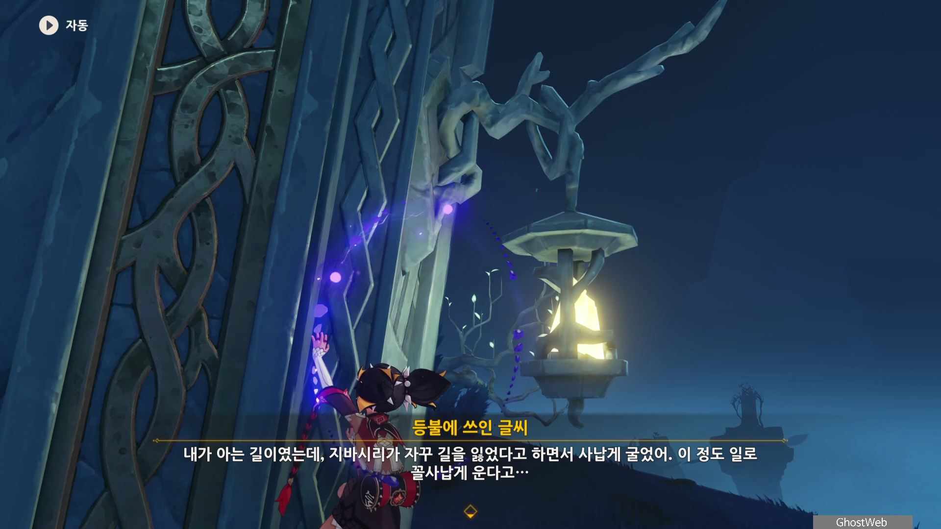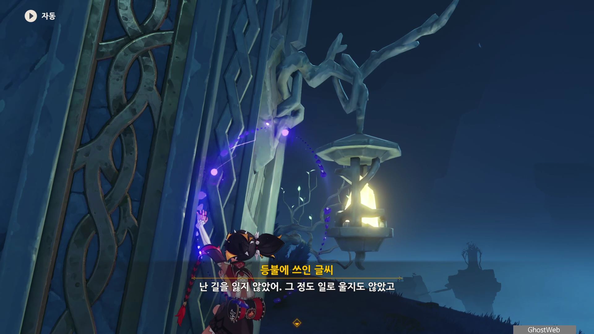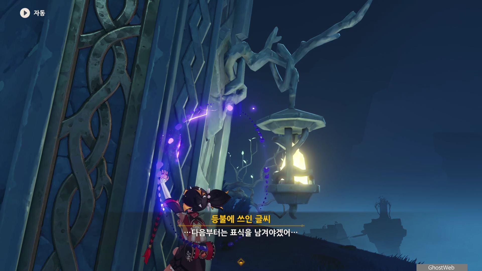 석문 왼쪽 앞 쪽에 있는 돌에 앉으면 페이몬이 "이게 카바야마가 남긴 표식이겠지. 가서 확인해볼까"하는데 석문을 타고 등불까지 올라가면 등불에 쓰인 글씨를 읽을 수 있어요.
