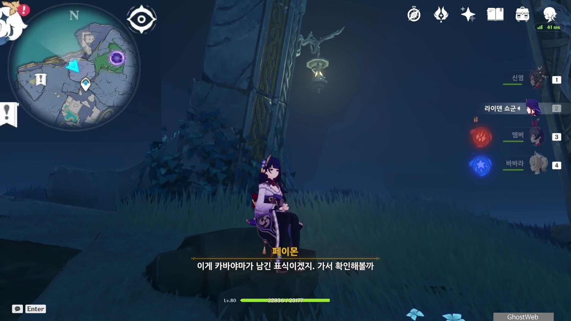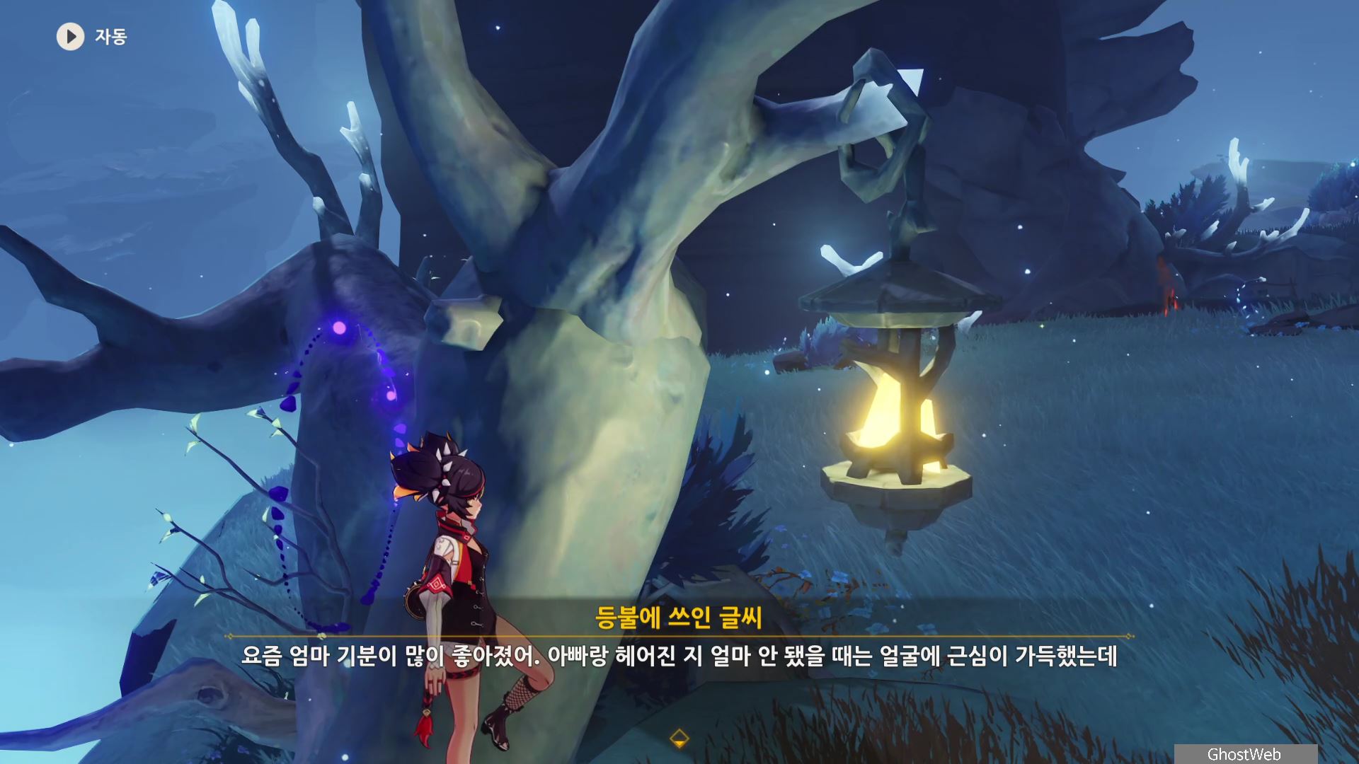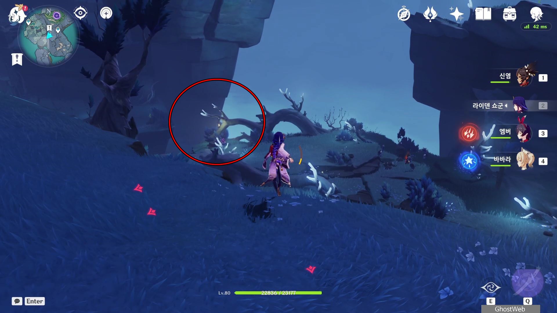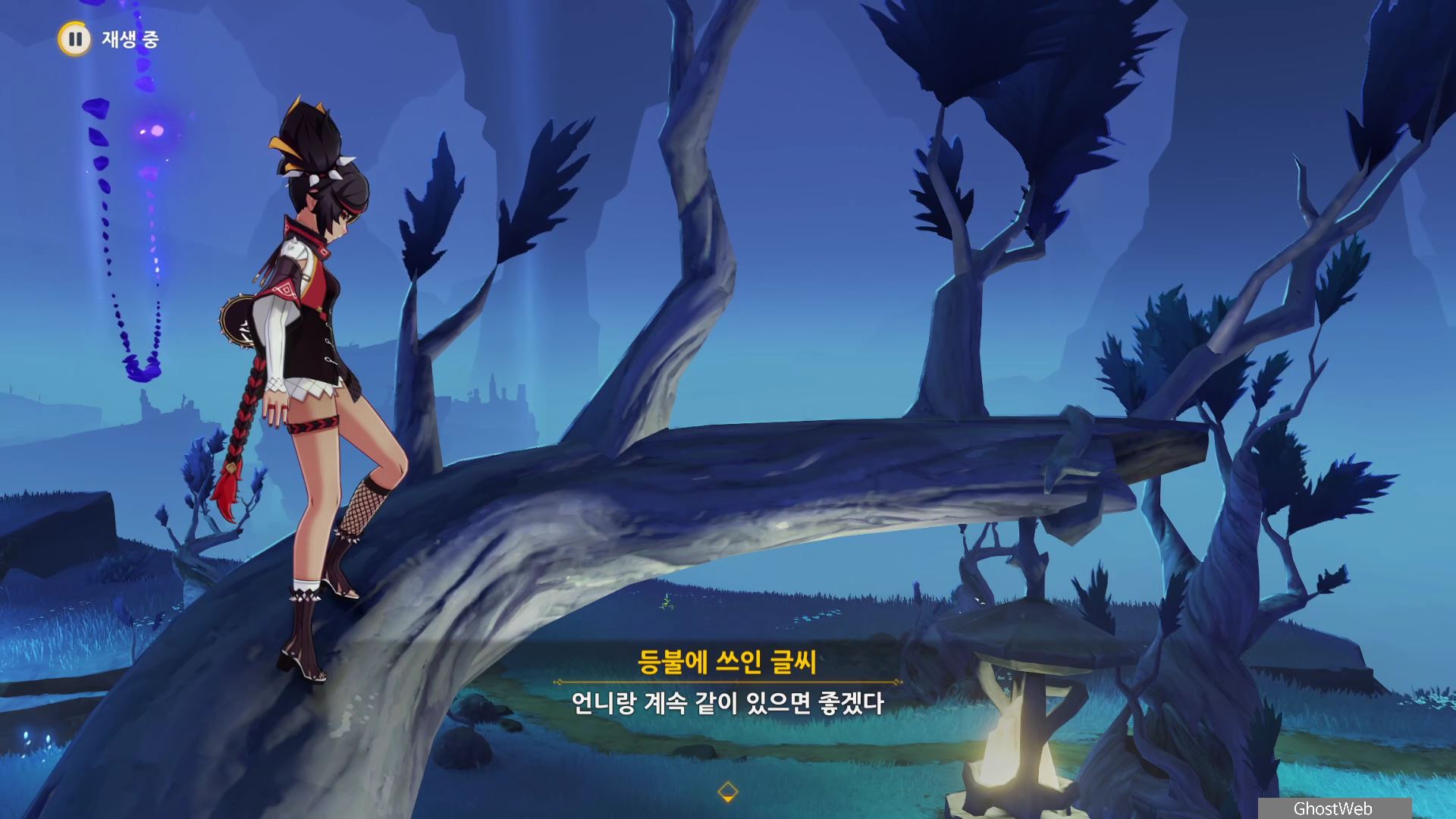 지도에서 상야의 사당 글자 위에 있는 워프 포인트로 이동하여 워프 포인트 기준 지도 7시 방향으로 걸어가 언덕에서 아래를 내려다 보면 끝 쪽에 나뭇가지(?)에 걸려 있는 등불이 보이는데, 주변에 심연 메이지, 츄츄족 들이 있으니 이 들을 처치하고 나무 왼쪽에 있는 바위에 앉으세요.