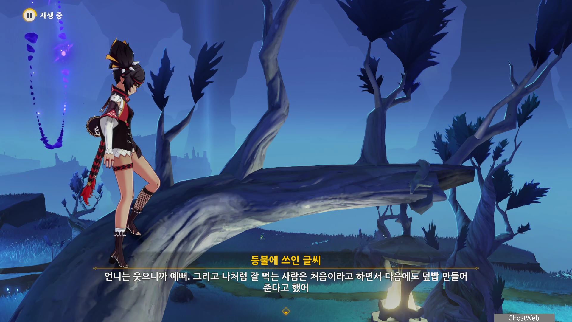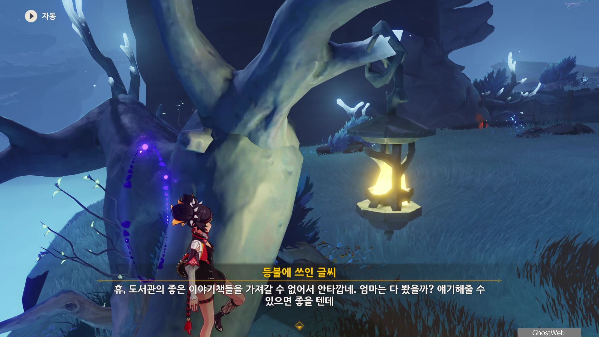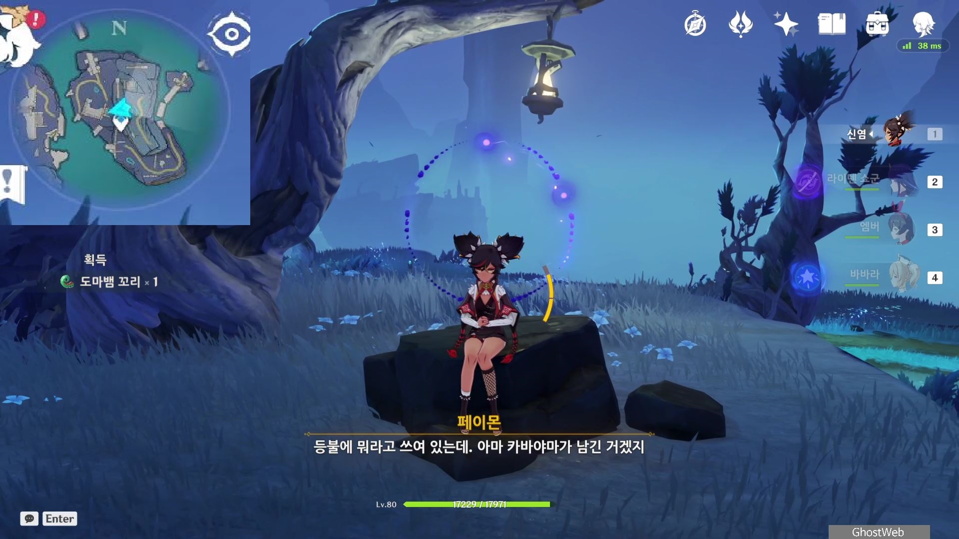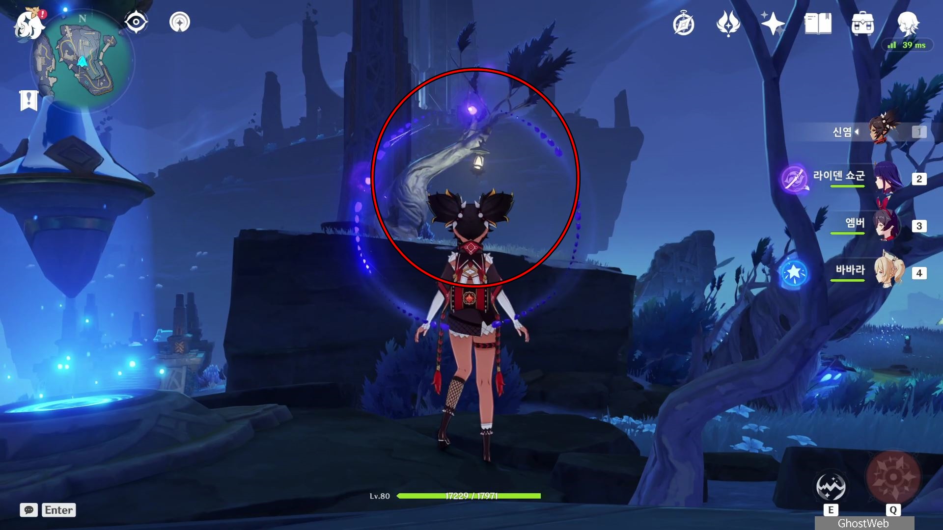지도에서 상야의 사당 글자 위에 있는 워프 포인트로 이동하여 워프 포인트 기준 지도 7시 방향으로 걸어가 언덕에서 아래를 내려다 보면 끝 쪽에 나뭇가지(?)에 걸려 있는 등불이 보이는데, 주변에 심연 메이지, 츄츄족 들이 있으니 이 들을 처치하고 나무 왼쪽에 있는 바위에 앉으세요.
