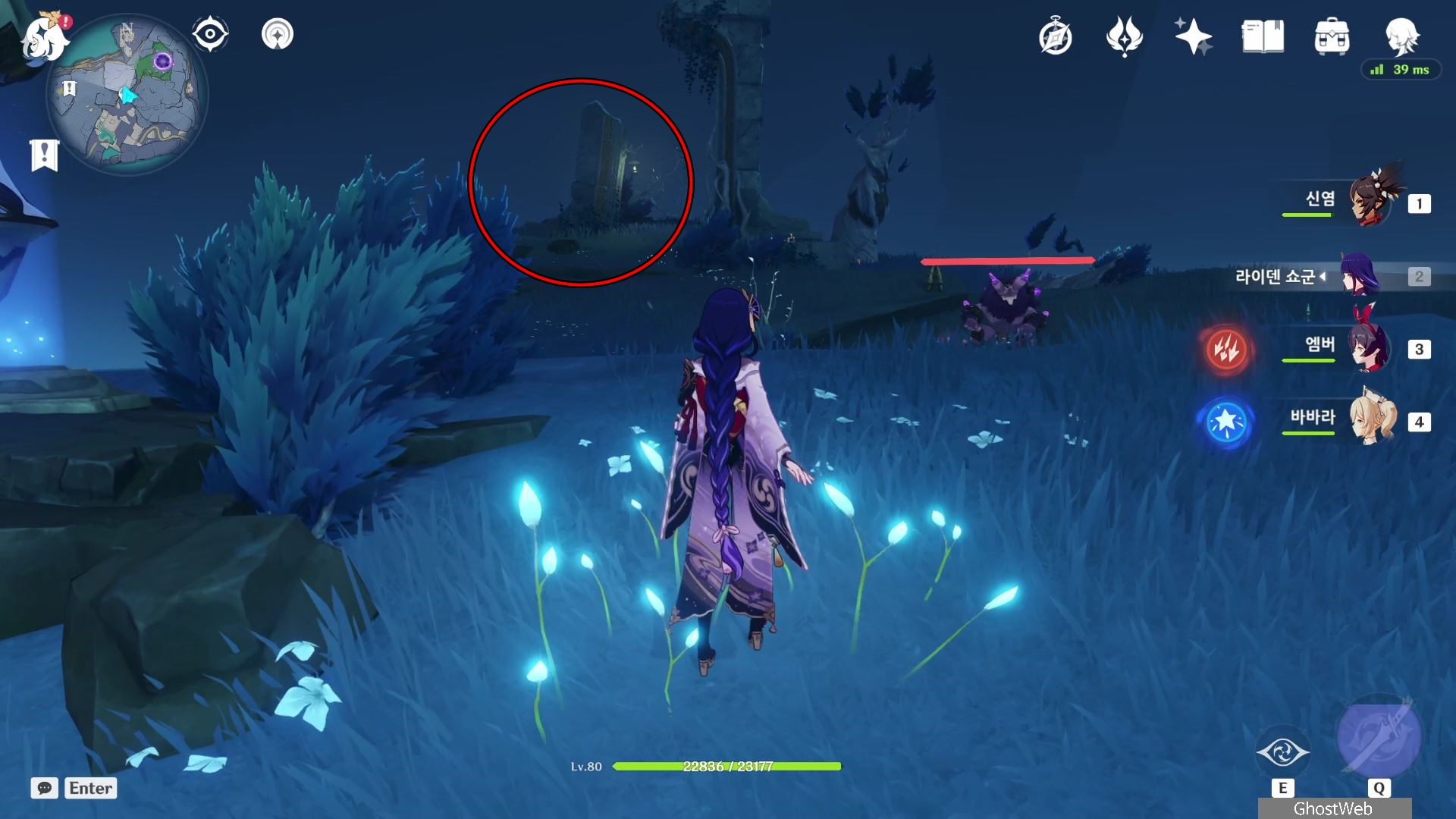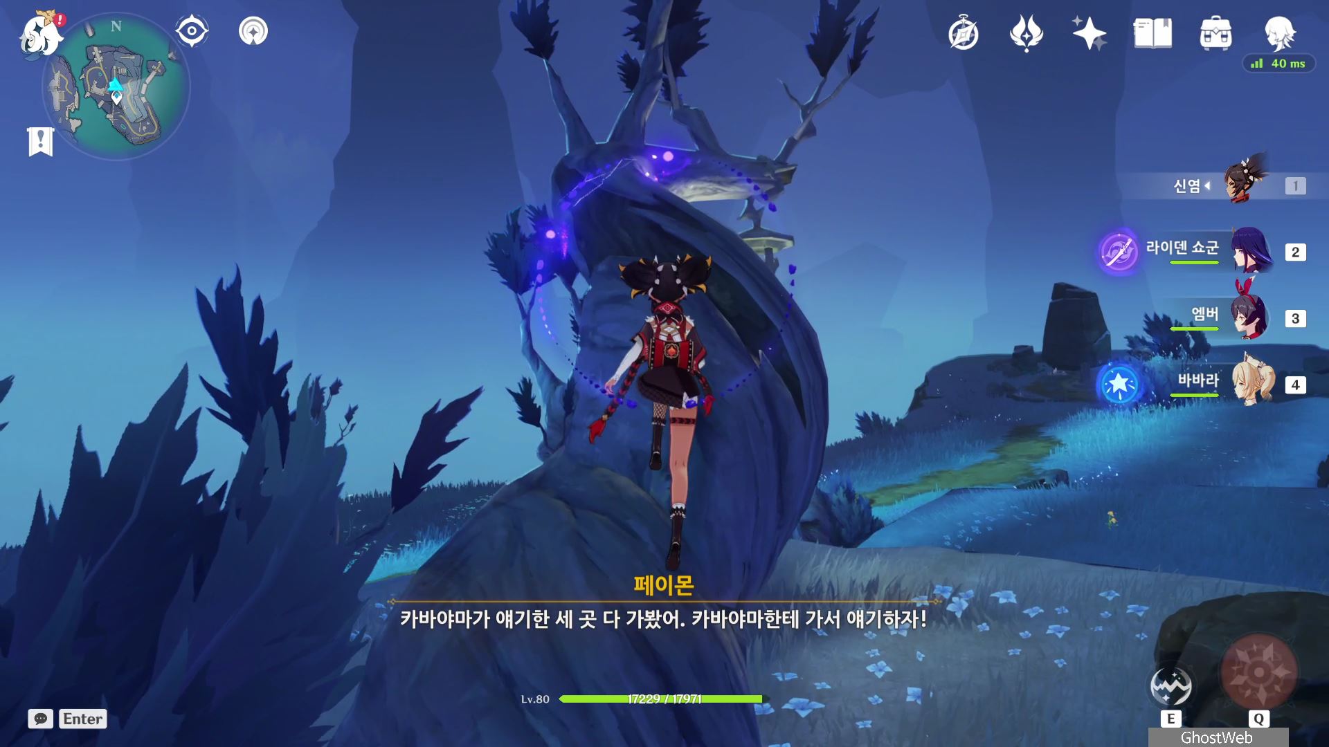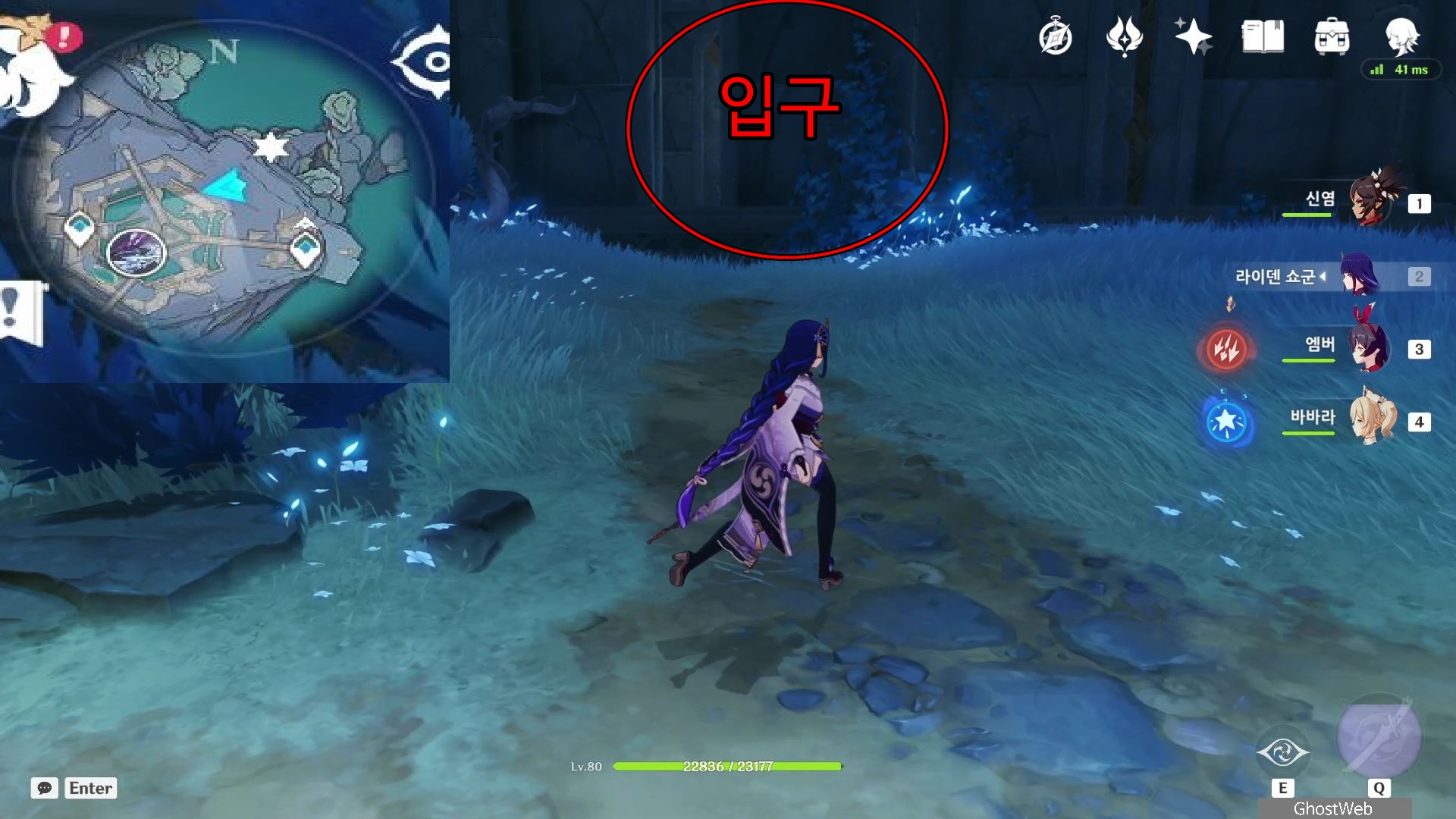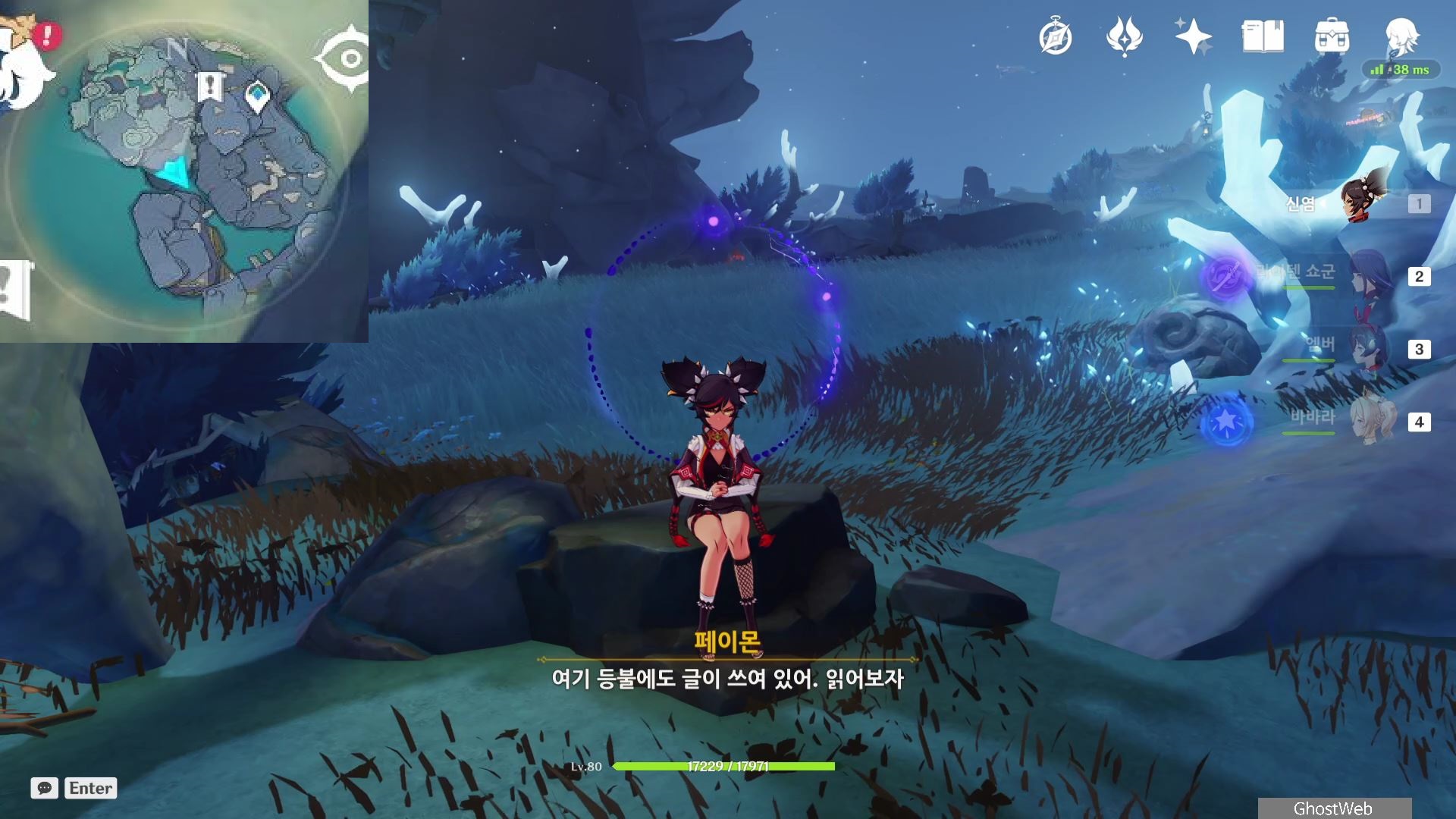 지도에서 상야의 사당 글자 위에 있는 워프 포인트로 이동하여 워프 포인트 기준 지도 7시 방향으로 걸어가 언덕에서 아래를 내려다 보면 끝 쪽에 나뭇가지(?)에 걸려 있는 등불이 보이는데, 주변에 심연 메이지, 츄츄족 들이 있으니 이 들을 처치하고 나무 왼쪽에 있는 바위에 앉으세요.