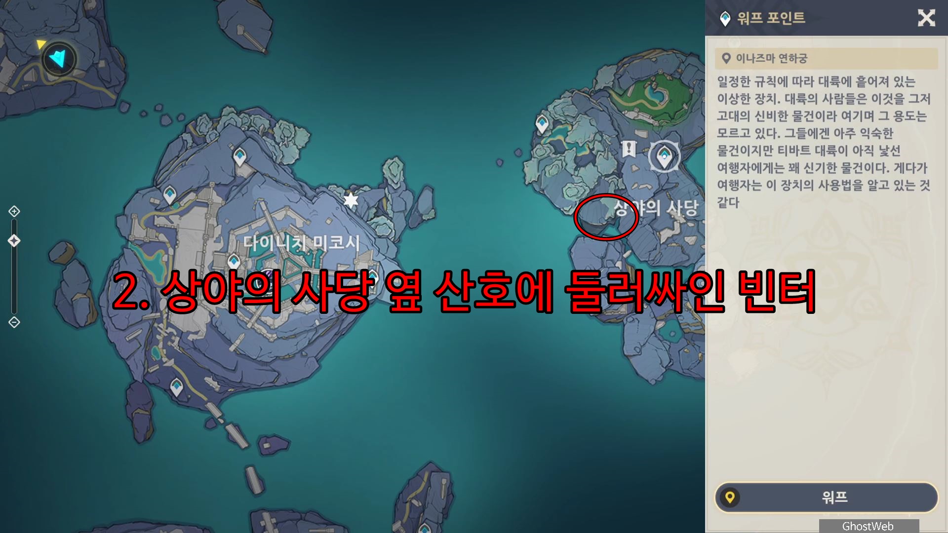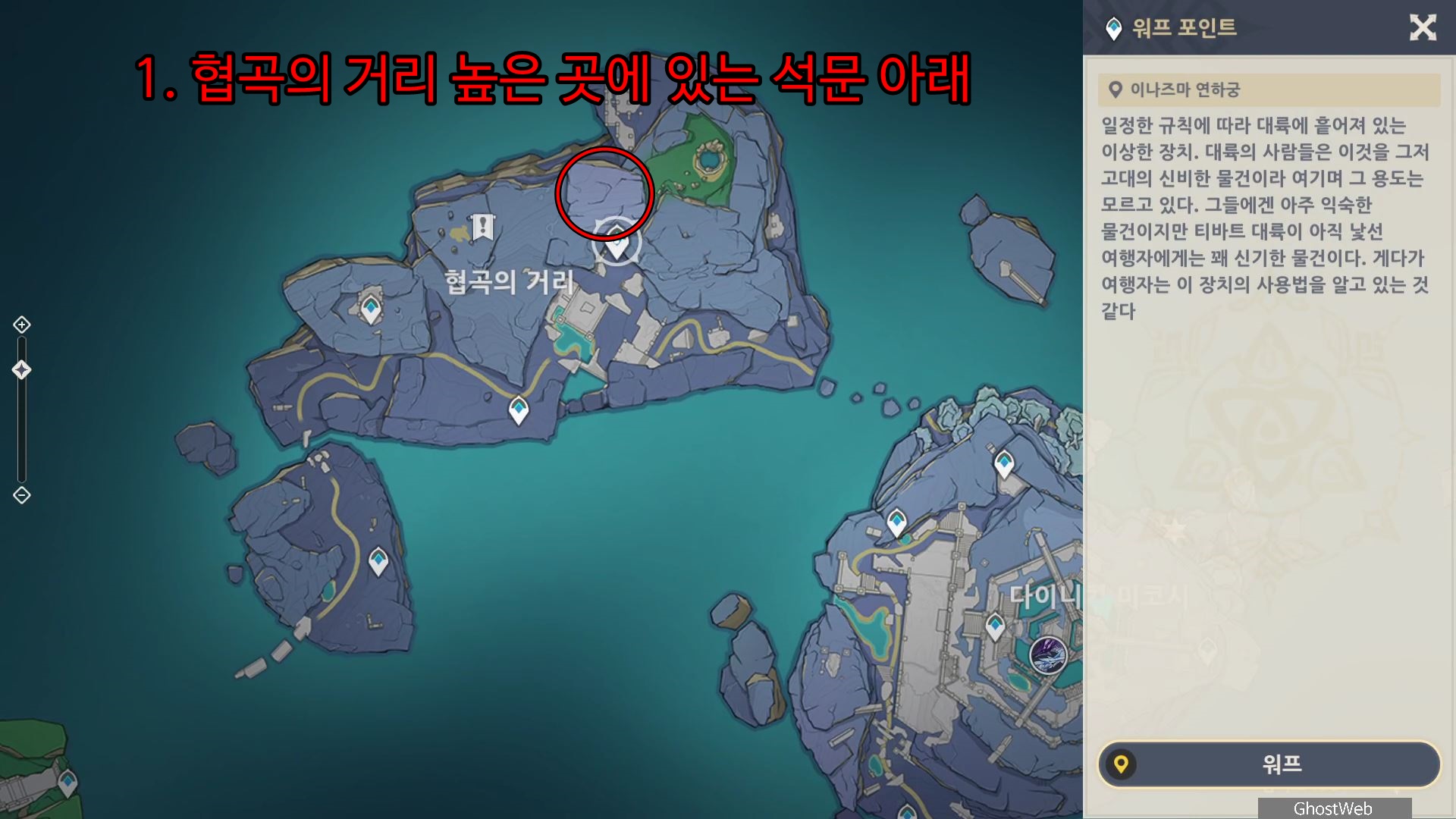 협곡의 거리 워프 포인트 중 제일 오른쪽 위쪽에 있는 워프 포인트로 이동하여 워프 포인트에서 11~12시 방향을 보면 큰 석문에 등불이 걸려 있는 곳을 볼 수 있어요.