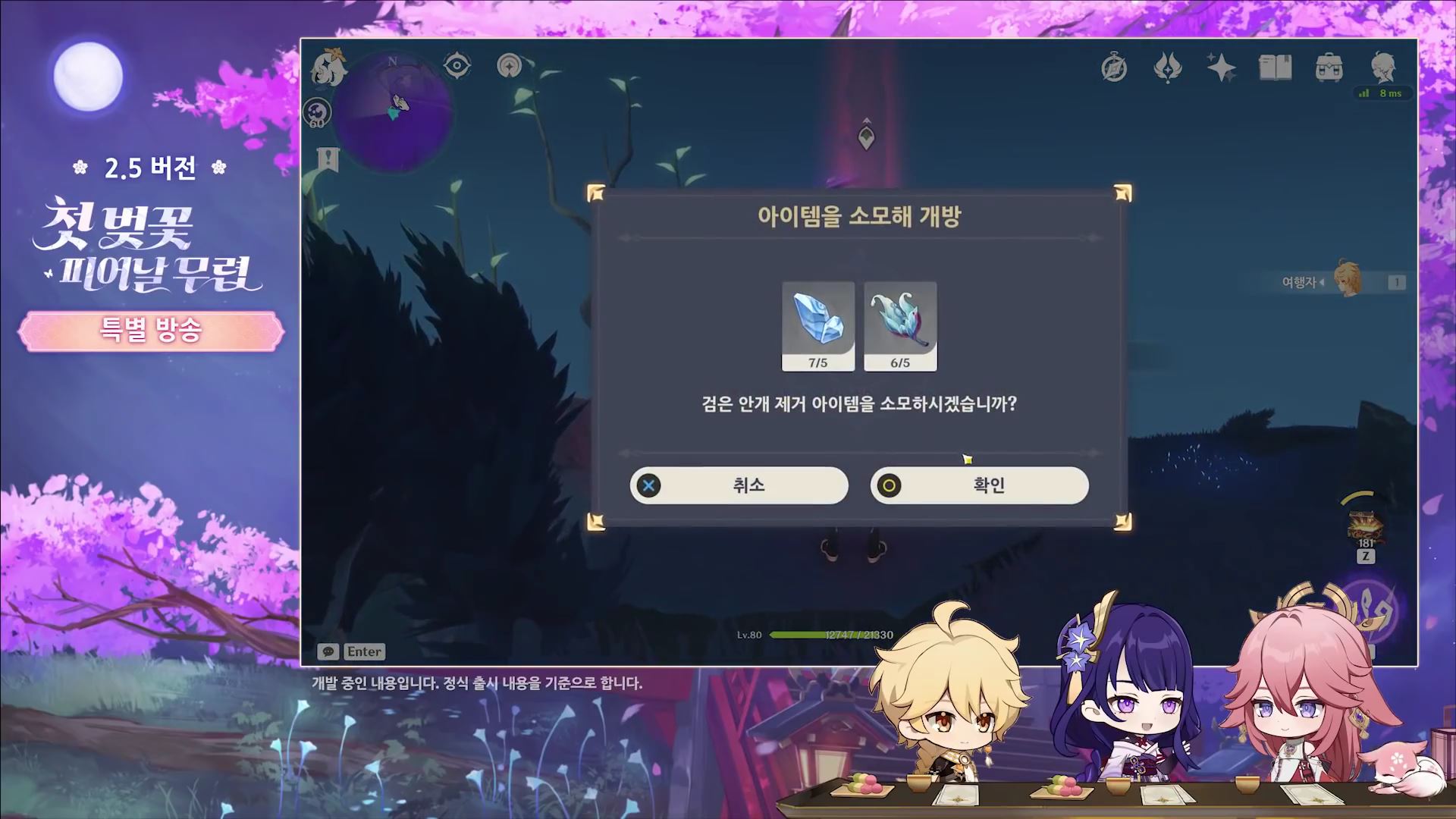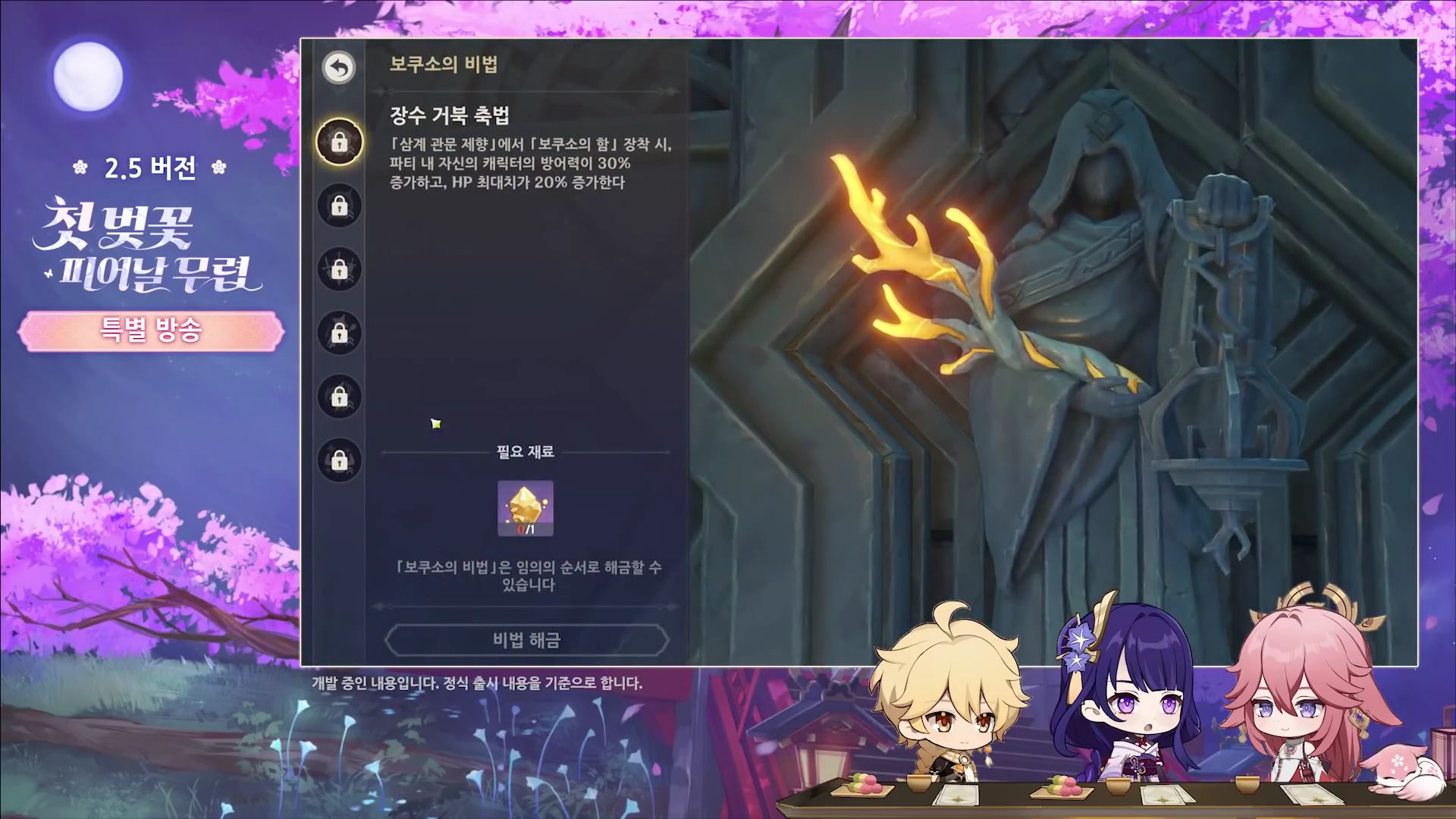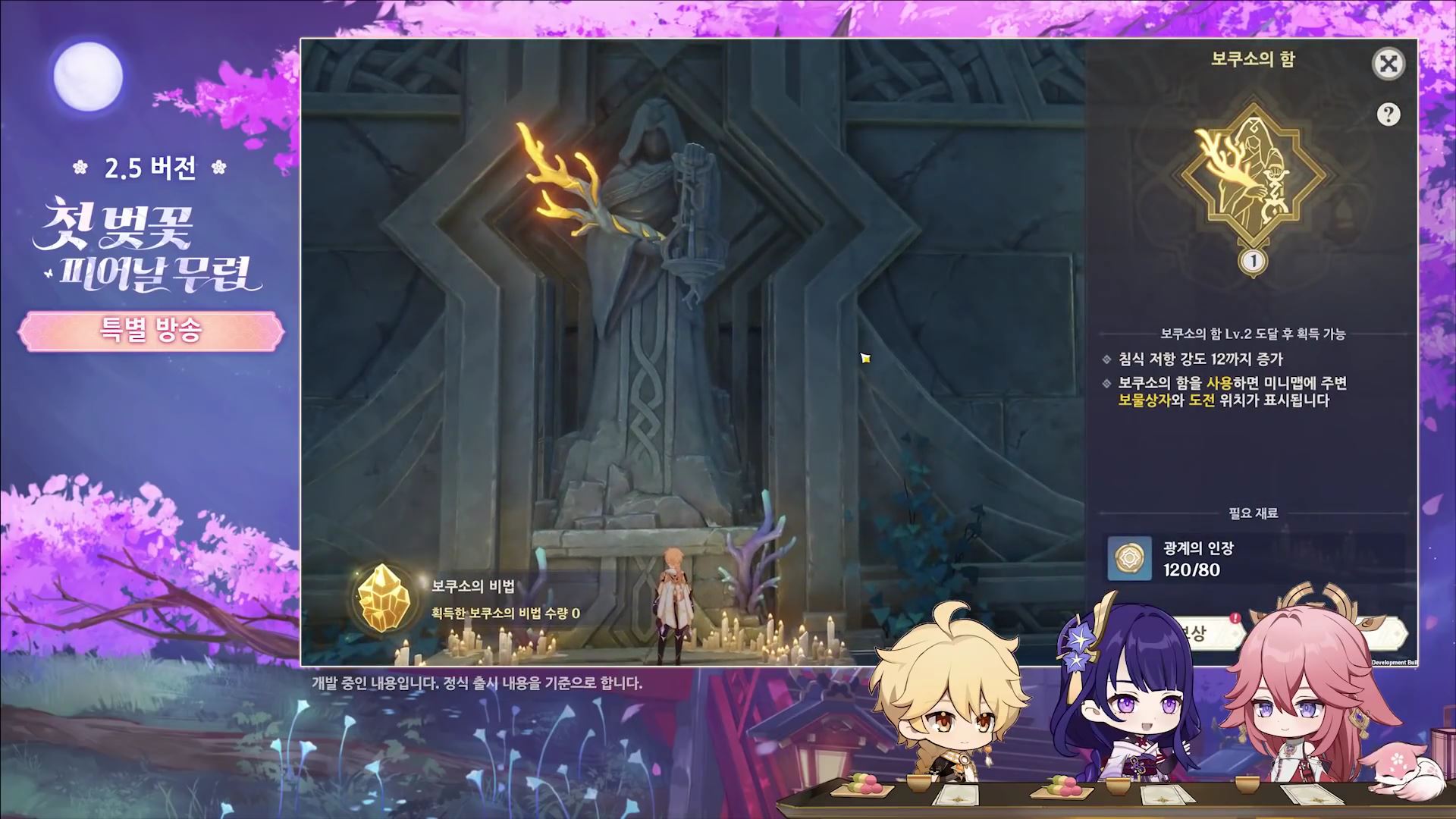 - 광계의 인장 공양을 통해 보쿠소의 함의 레벨을 상승 (침식 저항력, 에너지 최대치 증가, 미니맵의 보물상자 표시 등)