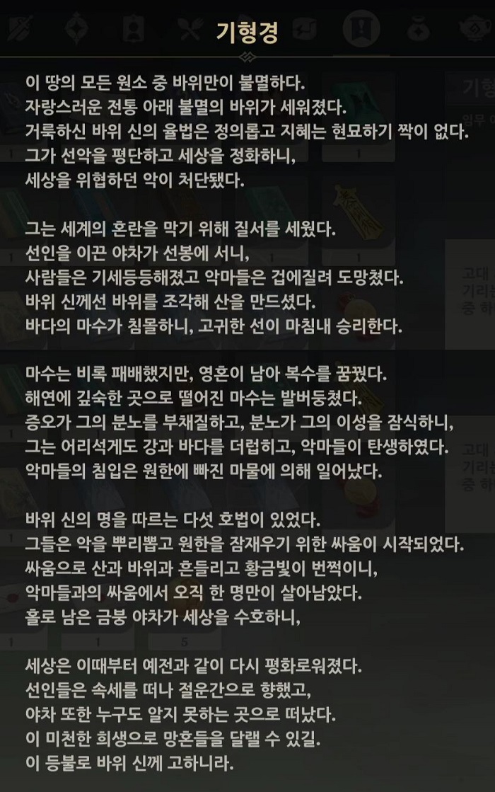 고대 사람들이 암왕제군과 선인 야차들을 기리는 주문이자, 고대 바위 신앙의 문헝 중 하나라고 한다.