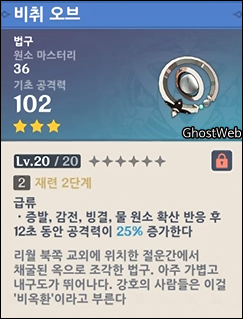 ○ 비취 오브 - 3성 법구 - 원소 마스터리 : 20 - 기초 공격력 : 40 ▷ 급류 - 증발, 감전, 빙결, 물 원소 확산 반응 후 12초 동안 공격력이 20% (25%/30%/35%/40%) 증가한다. ▷ 획득 방법 - ▷ 무기 돌파 소재 - 고운한림의 매끄러운 모래/휘암/해골/신체 (천둥 연산 밀궁 비경 도전 - 월/목/일요일) - 사냥꾼/특수 요원/검사관의 제도 (우인단 채무 처리인 처치/위치) - 보물찾기/실버/골드 까마귀 휘장 (보물사냥단 처치/위치) |