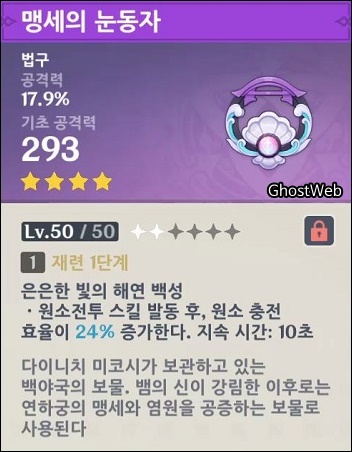 ○ 맹세의 눈동자 - 4성 법구 - 공격력 : 6% - 기초 공격력 : 44 ▷ 은은한 빛의 해연 백성 - 원소전투 스킬 발동 후, 원소 충전 효율이 24% (30%/36%/42%/48%) 증가한다. - 지속시간:10초 ▷ 획득 방법 - 삼계 관문 제향 이벤트 보상 (보쿠소의 함 공양) ▷ 무기 돌파 소재 - 먼바다의 산호 가지/옥빛 가지/마노 가지/금빛 가지 (유사의 정원 비경 도전 - 월/목/일요일) - 맹수 발톱/매수의 날카로운 발톱/맹수의 구신 발톱 (수계의 늑대 처치/위치) - 떠도는 정령 코어 껍데기/코어/결정화 코어 (떠도는 정령 처치/위치) |