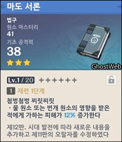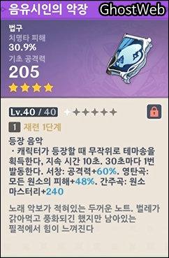 ○ 음유시인의 악장 - 4성 법구 - 치명타 피해 : 12% - 기초 공격력 : 42 ▷ 등장 음악 - 캐릭터가 등장할 때 무작위로 테마송을 획득한다. - 지속 시간 10초 - 30초마다 1번 발동한다. - 서창 : 공격력 + 60% (75%/90%/105%/120%) - 영탄곡 : 모든 원소의 피해 + 48% (48%/60%/72%/84%/96%) - 간주곡 : 원소 마스터리 + 240 (300/360/420/480) ▷ 획득 방법 - 기원 (가챠, 뽑기) ▷ 무기 돌파 소재 - 칼바람 울프의 젖니/이빨/부서진 이빨/그리운 고향 (세실리아의 모밭 비경 도전 - 화/금/일요일) - 지맥의 낡은 가지/마른 잎/새싹 (심연 메이지 처치/위치) - 부서진/오염된/불긴한 가면 (츄츄족 처치) |