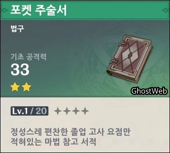 ○ 포켓 주술서 - 2성 법구 - 기초 공격력 : 33 ▷ 획득 방법 - 각 마을 대장간에서 구입 가능 (600 모라) ▷ 무기 돌파 소재 - |