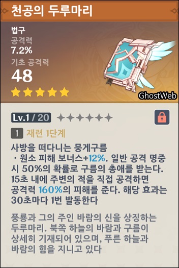 ○ 천공의 두루마리 - 5성 법구 - 공격력 : 7.2% - 기초 공격력 : 48 ▷ 사방을 떠다니는 뭉게구름 - 원소 피해 보너스 + 12% (15%/18%/21%/24%) - 일반 공격 명중시 50%의 확률로 구름의 총애를 받는다. - 15초내에 주변의 적을 직접 공격하면 공격력 160% (200%/240%/280%/320%) 의 피해를 준다. - 해당효과는 30초마다 1번 발동한다 ▷ 획득 방법 - 기원 (가챠, 뽑기) ▷ 무기 돌파 소재 - 칼바람 울프의 젖니/이빨/부서진 이빨/그리운 고향 (세실리아의 모밭 비경 도전 - 화/금/일요일) - 지맥의 낡은 가지/마른 잎/새싹 (심연 메이지 처치/위치) - 견고한/날카로운/역전의 화살촉 (츄츄 궁수 처치) |