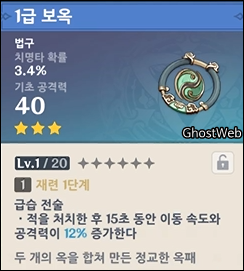 ○ 1급 보옥 - 3성 법구 - 치명타 확률 : 3.4% - 기초 공격력 : 40 ▷ 급습 전술 - 적을 처치한 후 15초 동안 이동 속도와 공격력이 12% (14%/16%/18%/20%) 증가한다. ▷ 획득 방법 - 필드에서 보물상자를 열어 획득 가능 ▷ 무기 돌파 소재 - 안개 구름 속의 흑연단/수은단/금단/전환 (천둥 연산 밀궁 비경 도전 - 화/금/일요일) - 안개꽃 가루, 안개풀 주머니, 안개 등심 (치친 술사 처치) - 신병/사관/위관의 휘장 (우인단 선발대 처치/위치) |
