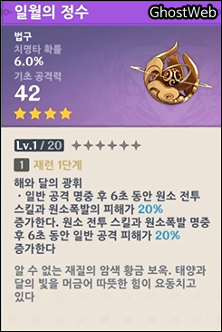 ○ 일월의 정수 - 4성 법구 - 치명타 확률 : 6% - 기초 공격력 : 42 ▷ 해와 달의 광휘 - 일반 공격 명중 후 6초 동안 원소 전투 스킬과 원소폭발의 피해 20% 증가한다. - 원소 전투 스킬과 원소폭발 명중 후 6초 동안 일반 공격 피해가 20% 증가한다. ▷ 획득 방법 - 기행에서 진주 기행 레벨을 LV. 30까지 올리면 보상 선택을 통해 획득 가능 (유료) ▷ 무기 돌파 소재 - |