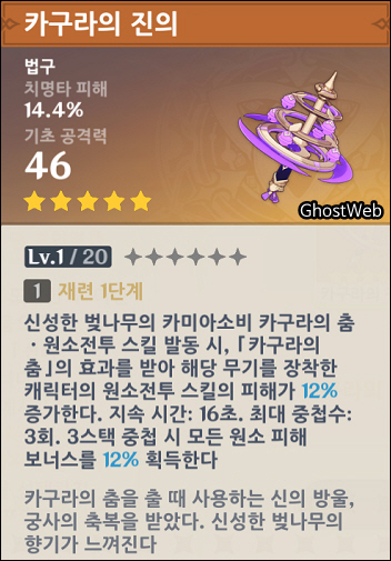 ○ 카구라의 진의 - 5성 법구 - 치명타 피해 : 10.8% - 기초 공격력 : 46 ▷ 신성한 벚나무의 카미아소비 카구라의 춤 - 원소전투 스킬 발동 시, 「카구라의 춤」의 효과를 받아 해당 무기를 장착한 캐릭터의 원소전투 스킬의 피해가 12% (15%/18%/21%/24%) 증가한다. - 지속 시간 : 16초 - 최대 중첩수 : 3회 - 3스택 중첩 시 모든 원소 피해 보너스를 12% (15%/18%/21%/24%) 획득한다. ▷ 획득 방법 - 기원 (가챠, 뽑기) ▷ 무기 돌파 소재 - 금석극화의 가면/호교/일각/귀인 (유사의 정원 비경 도전 - 수/토/일요일) - 맹수 발톱/매수의 날카로운 발톱/맹수의 구신 발톱 (수계의 늑대 처치/위치) - 떠도는 정령 코어 껍데기/코어/결정화 코어 (떠도는 정령 처치/위치) ▷ 장착 추천 캐릭터 : 야에 미코 |