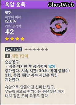 ○ 흑암 홍옥 - 4성 법구 - 치명타 피해 : 12% - 기초 공격력 : 42 ▷ 승승장구 - 적을 처치한 후 공격력이 12% (15%/18%/21%/24%) 증가한다. - 지속 시간 : 30초 - 최대 중첩수 : 3회 (중첩 1회당 지속 시간은 독립 계산) ▷ 획득 방법 - 상점에서 스타라이트 교환을 통해 획득 ▷ 무기 돌파 소재 - 고운한림의 매끄러운 모래/휘암/해골/신체 (천둥 연산 밀궁 비경 도전 - 월/목/일요일) - 사냥꾼/특수 요원/검사관의 제도 (우인단 채무 처리인 처치/위치) - 이능/봉마의/금주의 두루마리 (츄츄 샤먼 처치/위치) |
