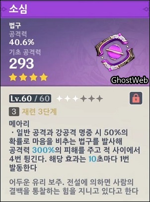 ○ 소심 - 4성 법구 - 공격력 : 12% - 기초 공격력 : 41 ▷ 메아리 - 일반 공격과 강공격 명중 시 50%의 확률로 마음을 비추는 법구를 발사해 공격력 240%(270%/300%/330%/360%)의 피해를 주고 적 사이에서 4번 튕긴다. - 해당 효과는 12초 (11초/10초/9초/8초)마다 1번 발동한다. ▷ 획득 방법 - 기원 (가챠, 뽑기) ▷ 무기 돌파 소재 - 안개 구름 속의 흑연단/수은단/금단/전환 (천둥 연산 밀궁 비경 도전 - 화/금/일요일) - 안개꽃 가루, 안개풀 주머니, 안개 등심 (치친 술사 처치) - 부서진/오염된/불긴한 가면 (츄츄족 처치) |