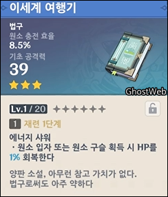 ○ 이세계 여행기 - 3성 법구 - 원소 충전 효율 : 8.5% - 기초 공격력 : 39 ▷ 에너지 샤워 - 원소 입자 또는 원소 구슬 획득 시 HP를 1% (1.25%/1.5%/1.75%/2%) 회복한다. ▷ 획득 방법 - ▷ 무기 돌파 소재 - 라이언 투사의 족쇄/쇠사슬/수갑/이념 (세실리아의 모밭 비경 도전 - 수/토/일요일) - 혼돈의 장치/회로/노심 (유적 가디언 처치/위치) - 부서진/오염된/불긴한 가면 (츄츄족 처치) |