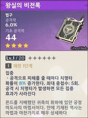 ○ 왕실의 비전록 - 4성 법구 - 공격력 : 6% - 기초 공격력 : 44 ▷ 집중 - 공격으로 피해를 줄 때마다 치명타 확률이 8% (10%/12%/14%/16%) 증가한다. - 최대 중첩수 : 5회 - 공격 시 치명타가 발생하면 모든 집중 효과가 사라진다. ▷ 획득 방법 - 상점에서 스타라이트 교환을 통해 획득 ▷ 무기 돌파 소재 - 고탑 왕의 잔해/절망/조각/깨진 꿈 (세실리아의 모밭 비경 도전 - 월/목/일요일) - 무거운/흑동/흑수정 나팔 (츄츄 폭도 처치/위치) - 신병/사관/위관의 휘장 (우인단 선발대 처치/위치) |