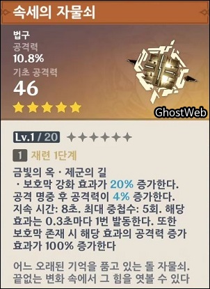 ○ 속세의 자물쇠 - 5성 법구 - 공격력 : 10.8% - 기초 공격력 : 46 ▷ 금빛의 옥 · 제군의 길 - 보호막 강화 효과가 20% (25%/30%/35%/40%) 증가한다. - 공격 명중 후 공격력이 4% (5%/6%/7%/8%) 증가한다. - 지속 시간 : 8초 - 최대 중첩 수 : 5회 - 해당 효과는 0.3초마다 1번 발동한다. - 또한 보호막 존재 시 해당 효과의 공격력 증가 효과가 100% 증가한다. ▷ 획득 방법 - 기원 (가챠, 뽑기) ▷ 무기 돌파 소재 - 흑운철 한 알/조각/일각/덩이 (천둥 연산 밀궁 비경 도전 - 수/토/일요일) - 약한/단단한/석화한 뼛조각 (새끼 바위 용 도마뱀 처치) - 부서진/오염된/불긴한 가면 (츄츄족 처치) |