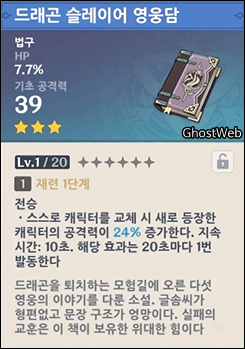 ○ 드래곤 슬레이어 영웅담 - 3성 법구 - HP : 7.7% - 기초 공격력 : 39 ▷ 전승 - 스스로 캐릭터를 교체 시 새로 등장한 캐릭터의 공격력이 24% (30%/36%/42%/48%) 증가한다. - 지속 시간: 10초 - 해당 효과는 20초마다 1번 발동한다 ▷ 획득 방법 - ▷ 무기 돌파 소재 - 칼바람 울프의 젖니/이빨/부서진 이빨/그리운 고향 (세실리아의 모밭 비경 도전 - 화/금/일요일) - 지맥의 낡은 가지/마른 잎/새싹 (심연 메이지 처치/위치) - 이능/봉마의/금주의 두루마리 (츄츄 샤먼 처치/위치) |