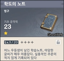 ○ 학도의 노트 - 1성 법구 - 기초 공격력 : 23 ▷ 획득 방법 - ▷ 무기 돌파 소재 - |