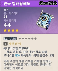 ○ 만국 항해용해도 - 4성 법구 - 원소 마스터리 : 24 - 기초 공격력 : 44 ▷ 에너지 주입 두루마리 - 원소 반응 후 10초 동안 원소 피해 보너스를 8% 획득한다. - 최대 중첩수 : 2회 ▷ 획득 방법 - 대장간에서 단조로 획득 - 단조 재료 : 북대륙의 법구 원형 1개, 수정덩이 50개, 백철 50개 ▷ 무기 돌파 소재 - 흑운철 한 알/조각/일각/덩이 (천둥 연산 밀궁 비경 도전 - 수/토/일요일) - 약한/단단한/석화한 뼛조각 (새끼 바위 용 도마뱀 처치) - 슬라임 응축액/청/원액 (슬라임 처치/위치) |