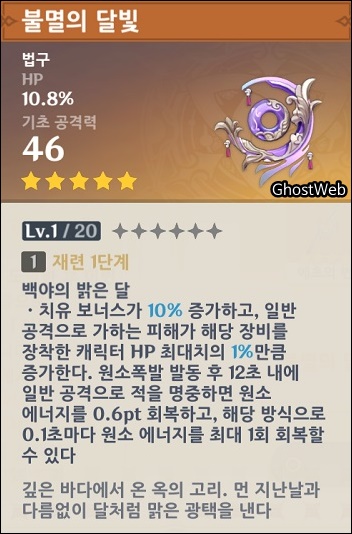 ○ 불멸의 달빛 - 5성 법구 - HP : 10.8% - 기초 공격력 : 46 ▷ 백야의 밝은 달 - 치유 보너스가 10% (12.5%/15%/17.5%/20%) 증가하고, 일반 공격으로 가하는 피해가 해당 장비를 장착한 캐릭터 HP 최대치의 1% (1.5%/2%/2.5%/3%) 만큼 증가한다. - 원소폭발 발동 후 12초 내에 일반 공격으로 적을 명중하면 원소 에너지를 0.6pt 회복하고, 해당 방식으로 0.1초마다 원소 에너지를 최대 1회 회복할 수 있다. ▷ 획득 방법 - 기원 (가챠, 뽑기) ▷ 무기 돌파 소재 - 먼바다의 산호 가지/옥빛 가지/마노 가지/금빛 가지 (유사의 정원 비경 도전 - 월/목/일요일) - 어두운/수정/편광 프리즘 (거울의 여인 처치/위치) - 떠도는 정령 코어 껍데기/코어/결정화 코어 (떠도는 정령 처치/위치) |