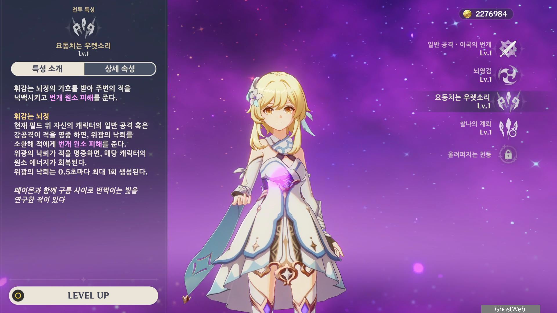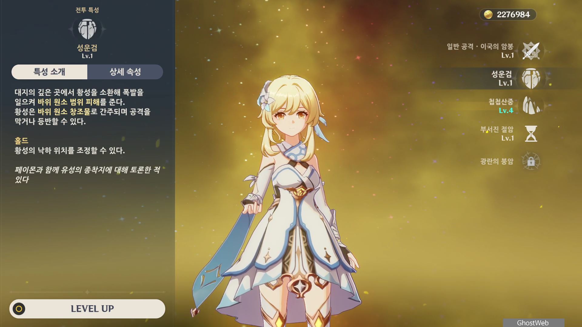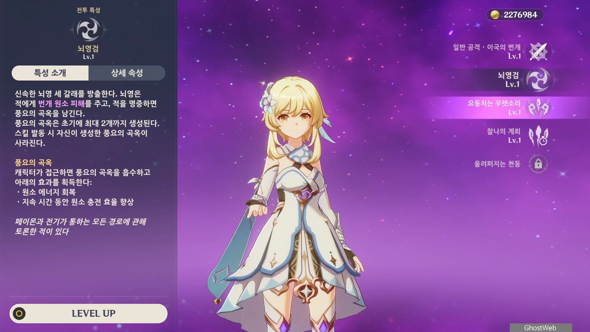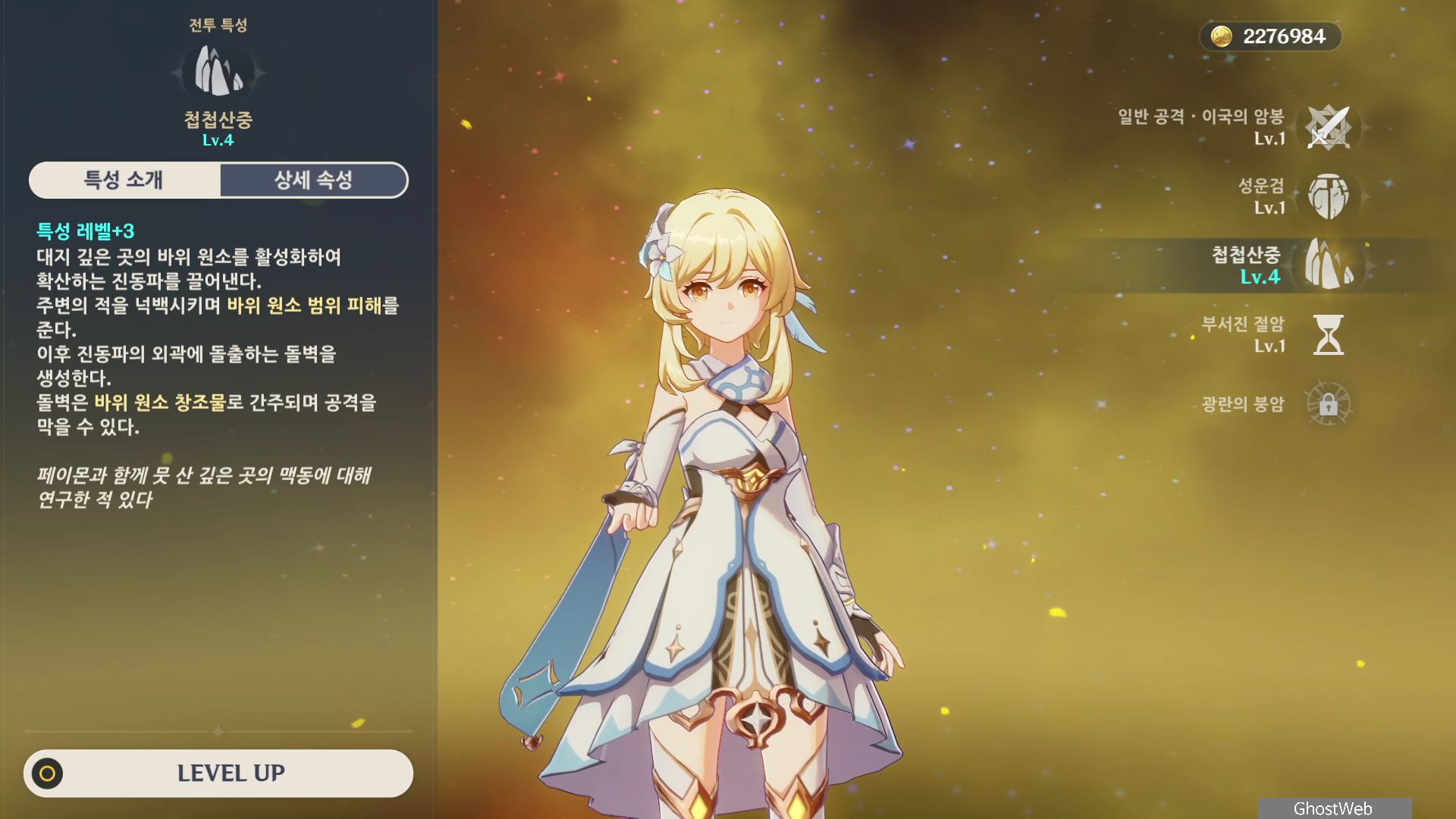각 원소 별로 여행자의 원소 전투 스킬, 특성 레벨이 독립적이니 각각 별도로 육성해야돼요.